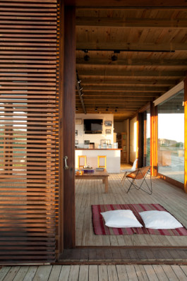 La sala principal de la casa de playa es un espacio con piso cálido, techo y paredes de madera de pinotea, y paredes de vidrio que deslumbran al paisaje circundante. La encimera con fregadero y heladera industrial de tres puertas, está rematada por un plano de apoyo superior que oficia a modo de barra. En la sala de estar, los sofás en forma de “l” repiten la morfología exterior con estructura de lapacho y cojines blancos.