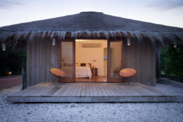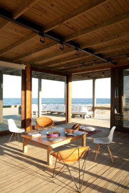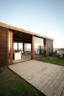Los 100 m2 cubiertos se expanden cómodamente en un living, comedor, barra y cocina, y cuenta con un dormitorio con vestidor, un baño y 70 m2 de decks equipados con colchones y camastros. Una terraza elevada en forma de “L” enmarca el exterior de la casa de playa mirando al mar.