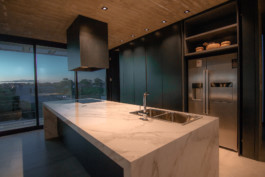 Los tonos de grises de las losas de hormigón visto, los pisos en grandes placas color cemento, la carpintería de madera en gris oscuro con una laca perfecta se destacan, al igual que el mesón de la cocina y detalles de herrería en negro.