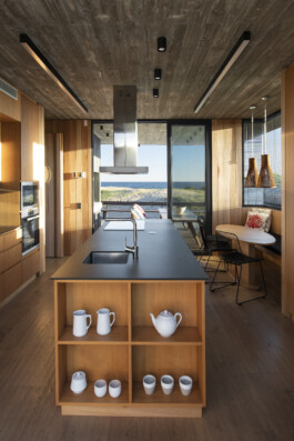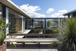 La organización funcional privilegia la secuencia social: comedor, estar, cocina y parrillero se alinean en un gesto horizontal continuo, conectados por un amplio deck que los recorre y los extiende hacia el exterior. Esta continuidad espacial responde a una búsqueda esencial del estudio: una arquitectura que dialogue con la naturaleza y propicie la vida al aire libre.