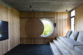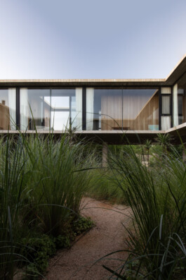 La casa se posa sobre pilares, separándose del terreno natural para generar el menor impacto posible. Esta estrategia responde no solo a una decisión de respeto por el entorno, sino también a una lógica funcional: liberar la planta baja, donde se ubican cocheras y espacios de servicio que se funden con la vegetación nativa del sitio. Por encima, la planta alta se proyecta hacia el paisaje, liviana, como suspendida.