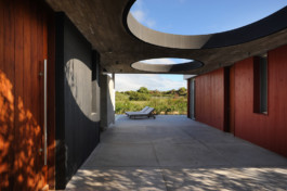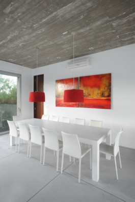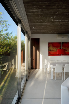 Las relaciones entre los habitantes de la casa tienen lugar en una galería de hormigón que constituye el verdadero nexo de unión tanto arquitectónico, porque articula los tres volúmenes, como familiar, porque acoge las actividades de reunión alrededor de la chimenea y en el comedor exterior.