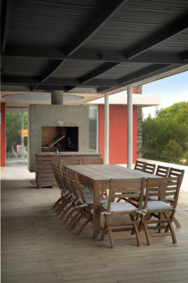 La galería está cubierta por lucernarios circulares y revestida con madera pintada de rojo y negro. Juntos, estos elementos crean un extraordinario juego de color: los espacios se inundan de luces y sombras, variables según las distintas versiones del sol que ofrece Punta del Este.