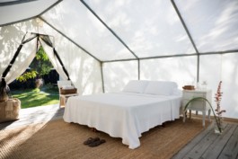 El campamento está compuesto por cuatro cabañas de invitados, con todo el confort que se pueda pedir, y dos tiendas de campaña con camas dobles que se levantan en la parte superior de grandes terrazas, donde se puede disfrutar de la misma vista que en la casa principal. También, cuenta con un gimnasio, un garaje, una cancha de tenis, una huerta, un invernadero, una oficina y un atelier. Así, se descubrió una nueva forma de diseñar una casa de verano y que ofreciera mucha libertad a todos sus huéspedes.