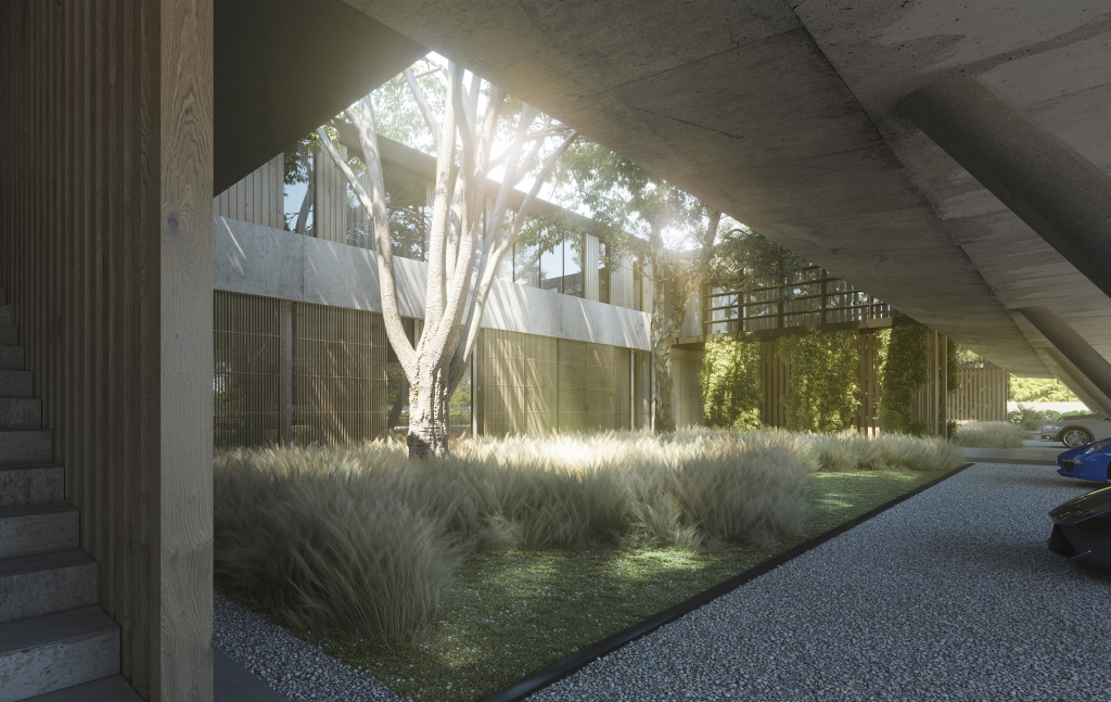 Entre la calle y el edificio, se propone un pulmón verde el cual cumple un papel primordial ya que genera una barrera tanto visual como funcional, aislando el área edificada de la calle y el Tren De La Costa, proponiendo allí áreas de sociabilización con parrillas y fogones para compartir con invitados.