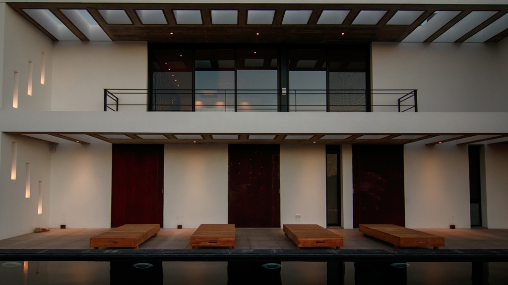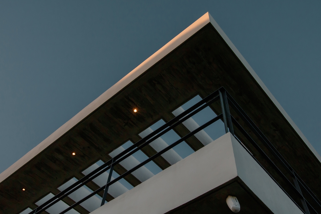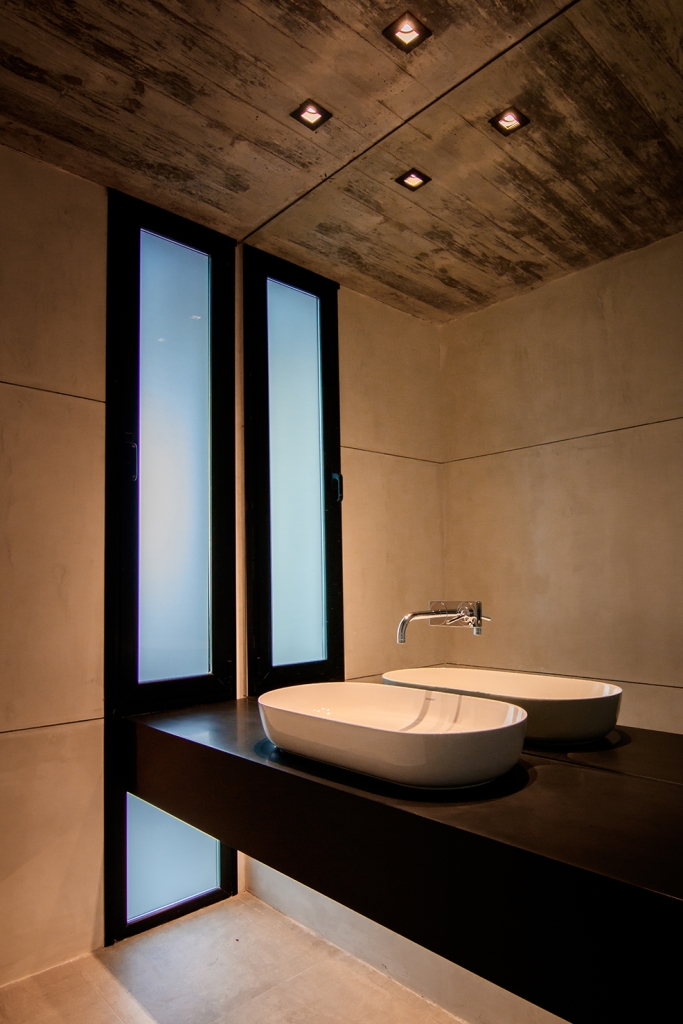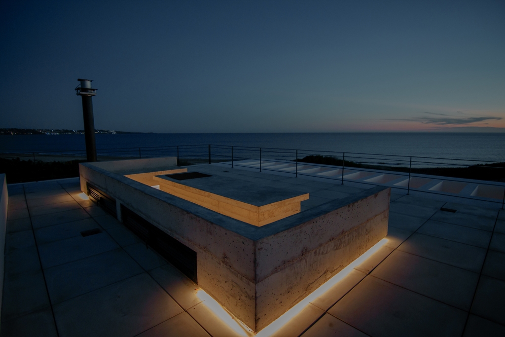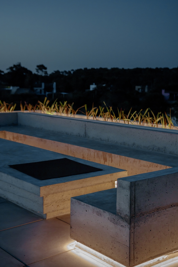Overlooking the ocean, the rooftop has the best views. Surrounded by plants and equipped with a large U-shaped bench made of exposed concrete that encloses a fireplace, the space is ideal for enjoying both night and day.