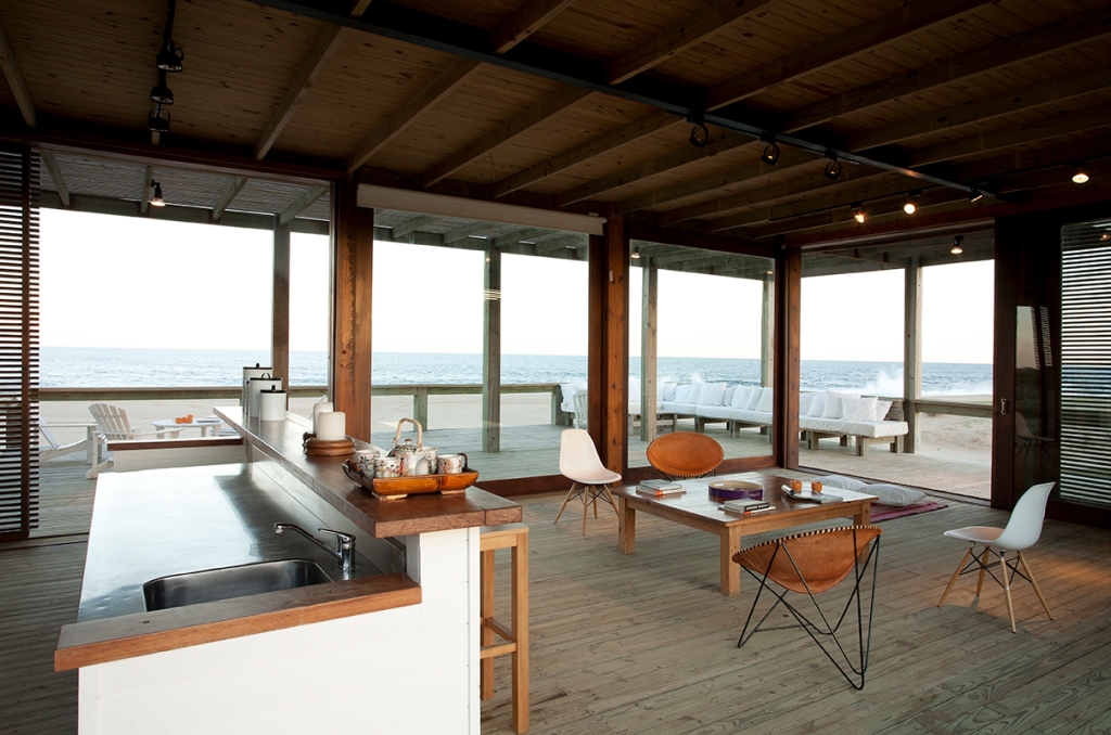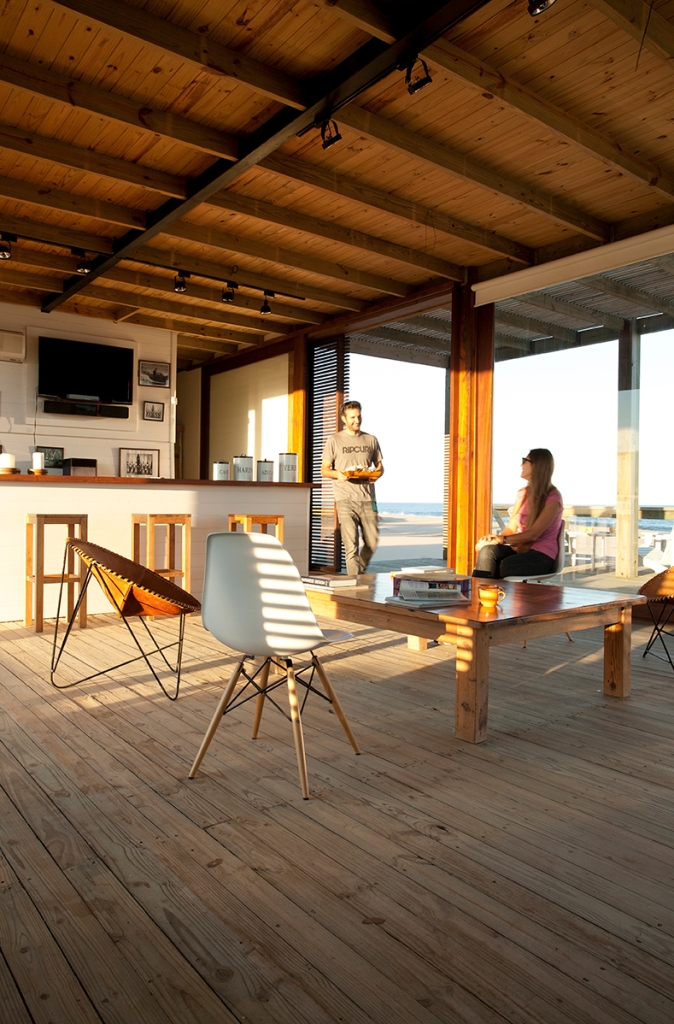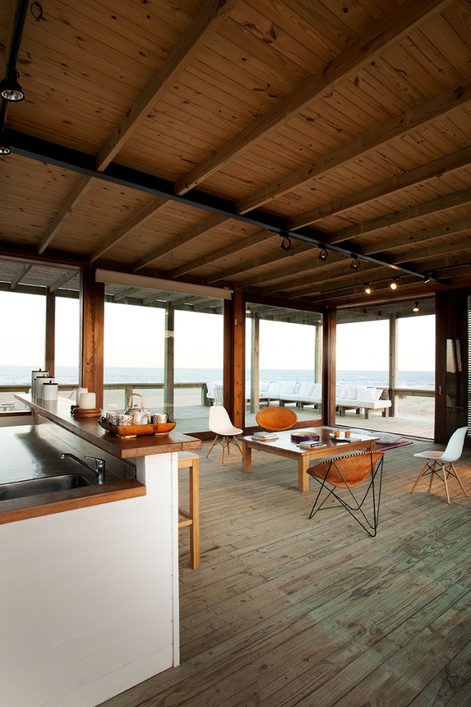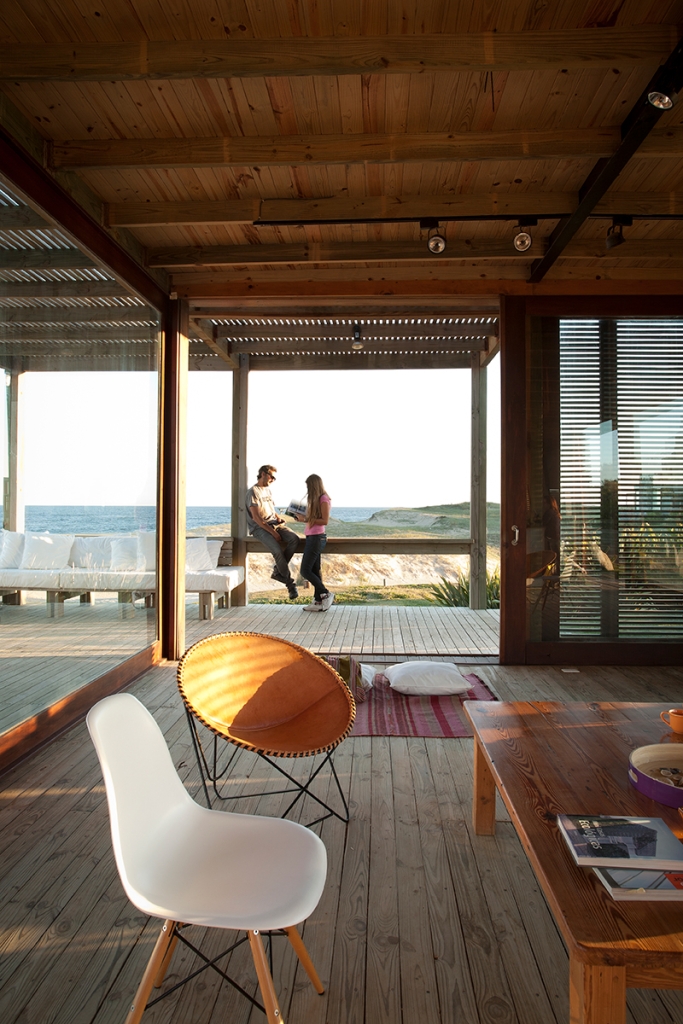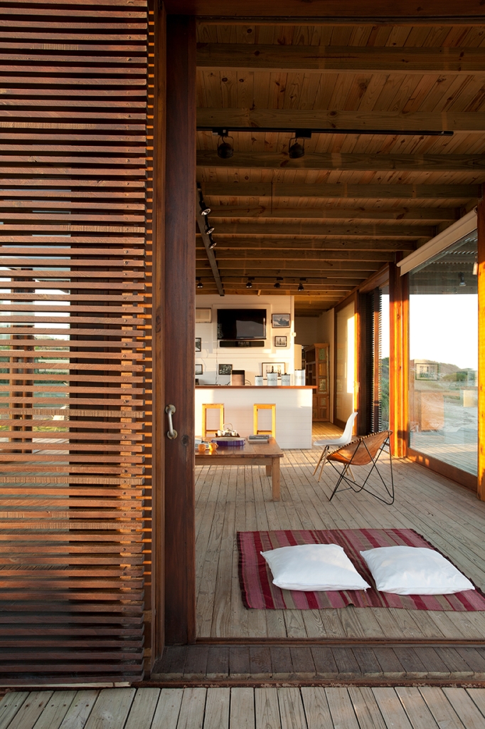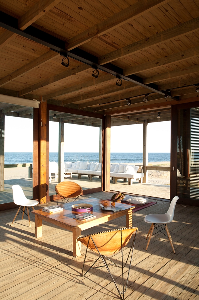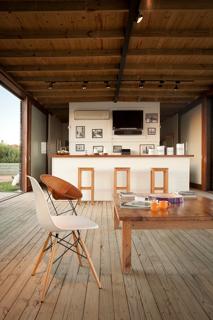 The main room of the beach house is this space with a warm floor, roof and walls of pinotea wood, and glass walls that strip to the surrounding landscape. The counter with kitchen sink and three door industrial refrigerator, is topped by a higher plane of support officiating as a bar. In the living room, the “l” shaped sofas repeat the exterior model with lapacho structure and white cushions.