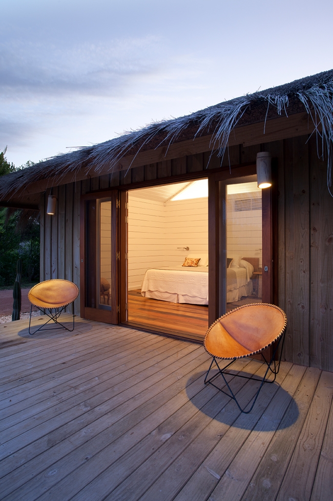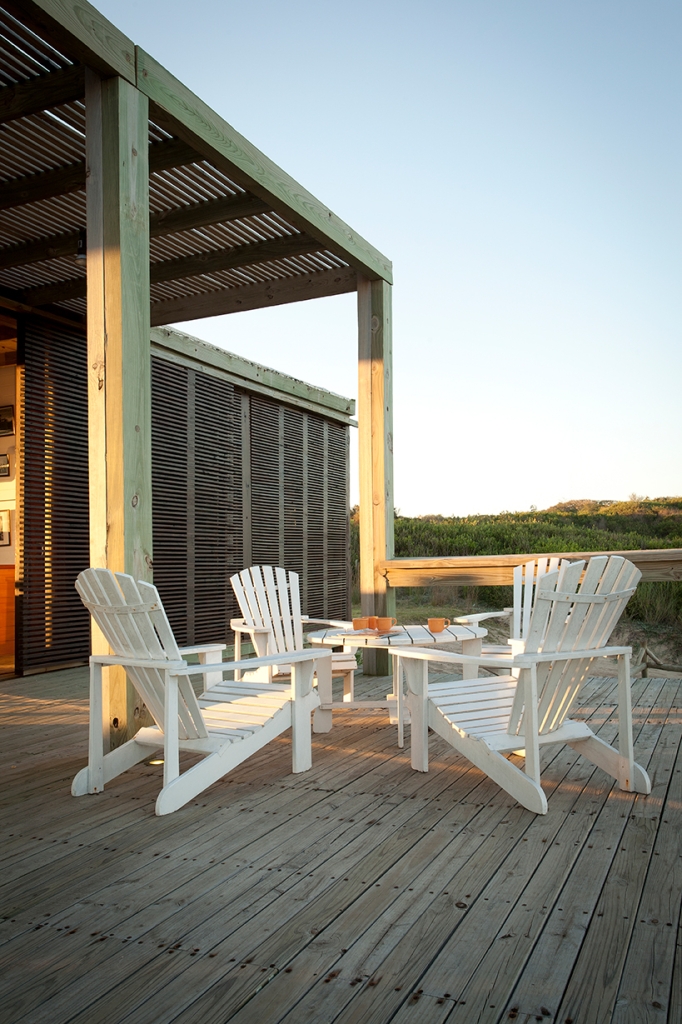 The deck and pergolas are made of lapacho, a noble wood also used for the structure of the outdoor chairs. Wood panels give intimacy to the private sector of the house without removing any natural light.
