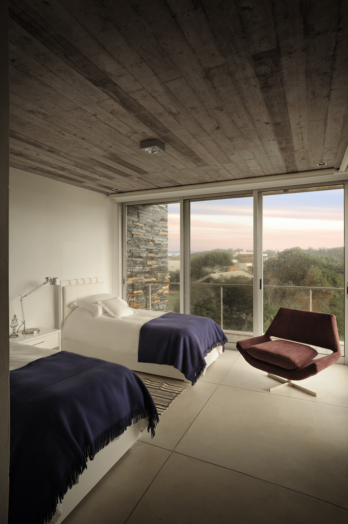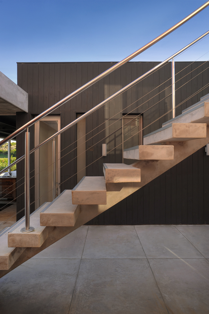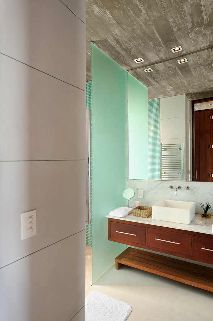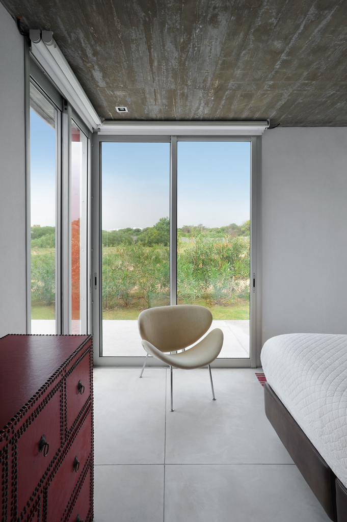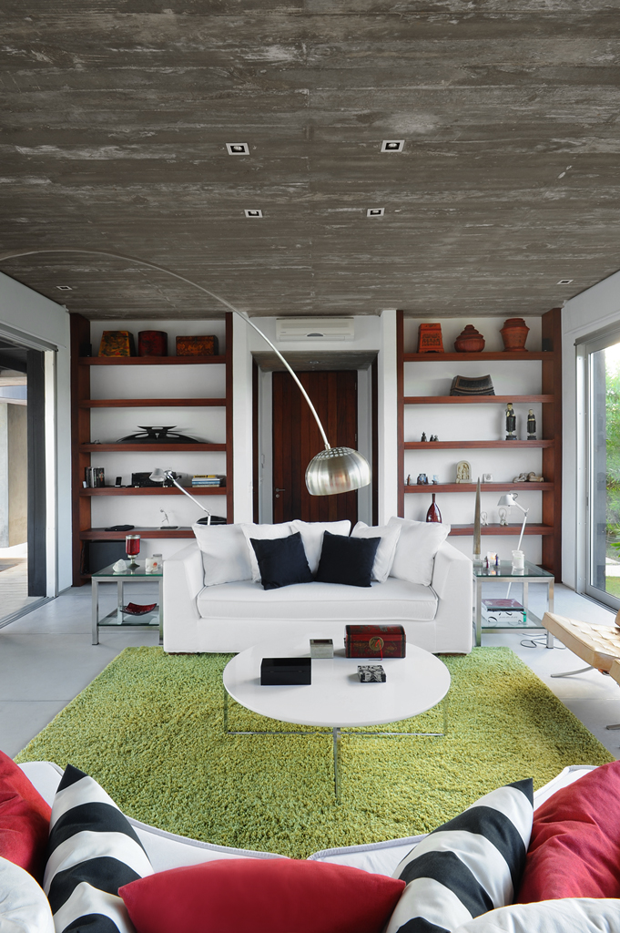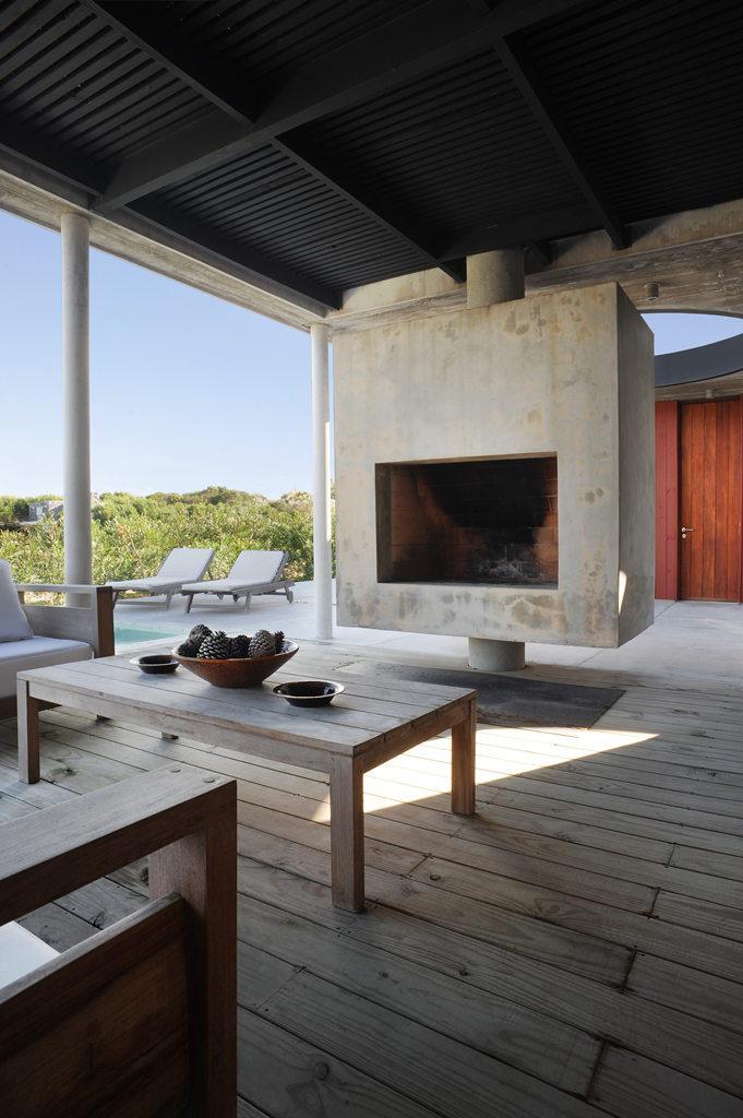 The inhabitants of the house interact in a concrete veranda, which is the true heart of the home in terms of both architecture as it articulates all three volumes and the family, because it is the site of their communal activities—gathered around the fireplace and in the outdoor dining room.