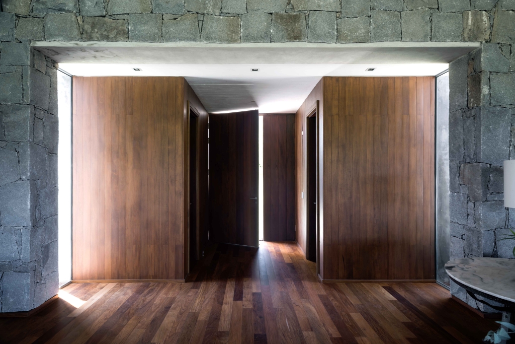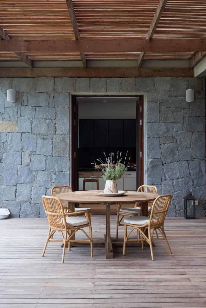 We never wanted to lose sight of the idea of the country house. Therefore, we decided that it should be wrapped by long shadows shed by lapacho pergolas ornamented with fuchsia flowering Santa Rita creepers. We used few materials, only concrete and old wood boards, recovered from a convent in the south of Brazil, which gave the project the character of well-aged elements, added to the granite stone which contributes its resistance and makes this a house with very low maintenance.