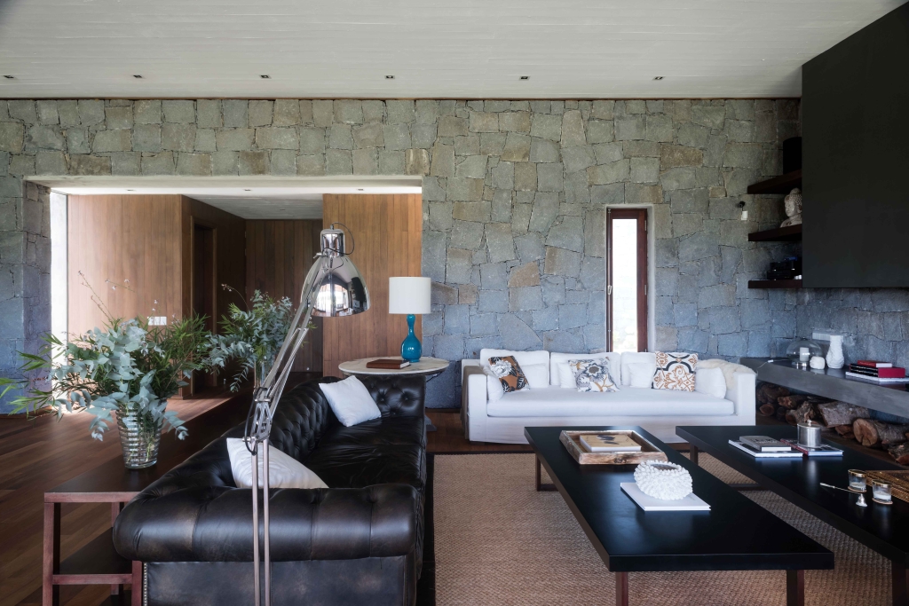 Taking into account the incredible views of the lake and the countryside, the blocks of the main rooms were arranged so that they all had the best views. These rooms open onto a garden on the same level as the internal floors and, for this, a stone retaining wall was erected to contain a large green platform, thus generating a level drop where the pool and barbecue were placed. This platform, approximately 2 and a half acres in size, allowed the house to be set on firm ground, balancing the level of tectonicity of the large stone volume.