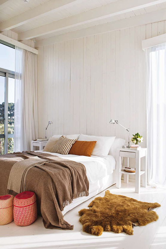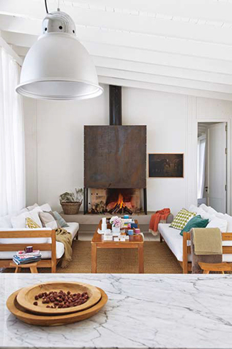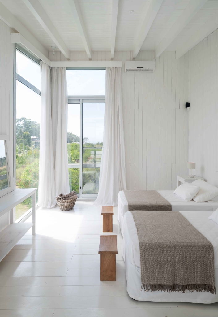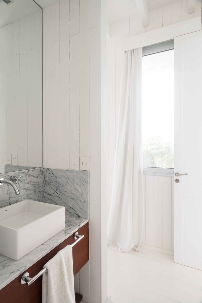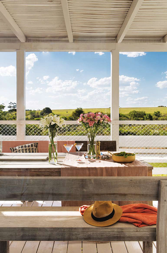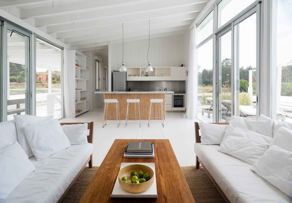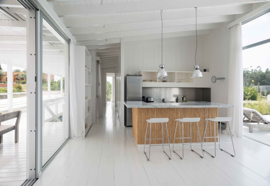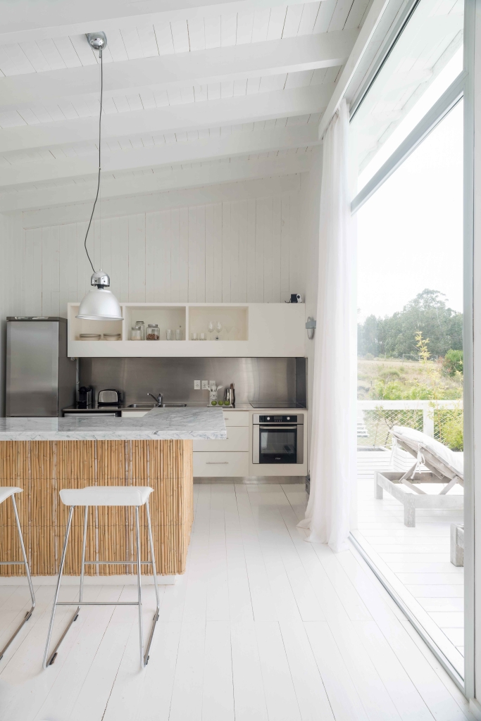 The interior did not allocate space to the dining room. The dining table is only outside, on the covered deck. Inside, only a double-height U-shaped bar where marble was combined for the counter and cane for the base. On the outdoor deck there is a long table built in lapacho, with benches with backs designed to extend the table and of course, a barbecue with a view of the magical Uruguayan sunsets and protected from the sea wind.