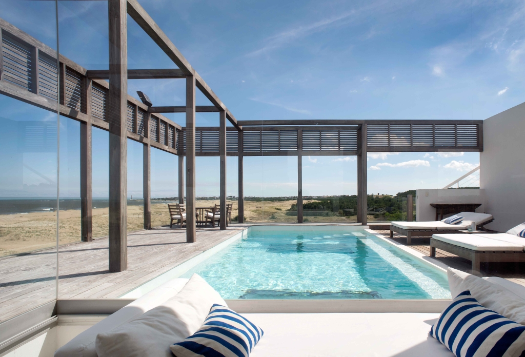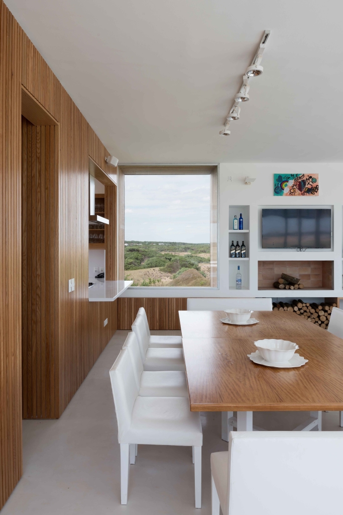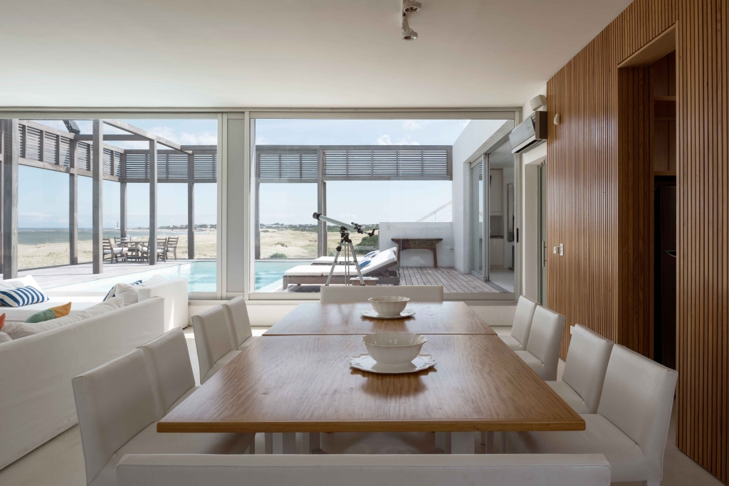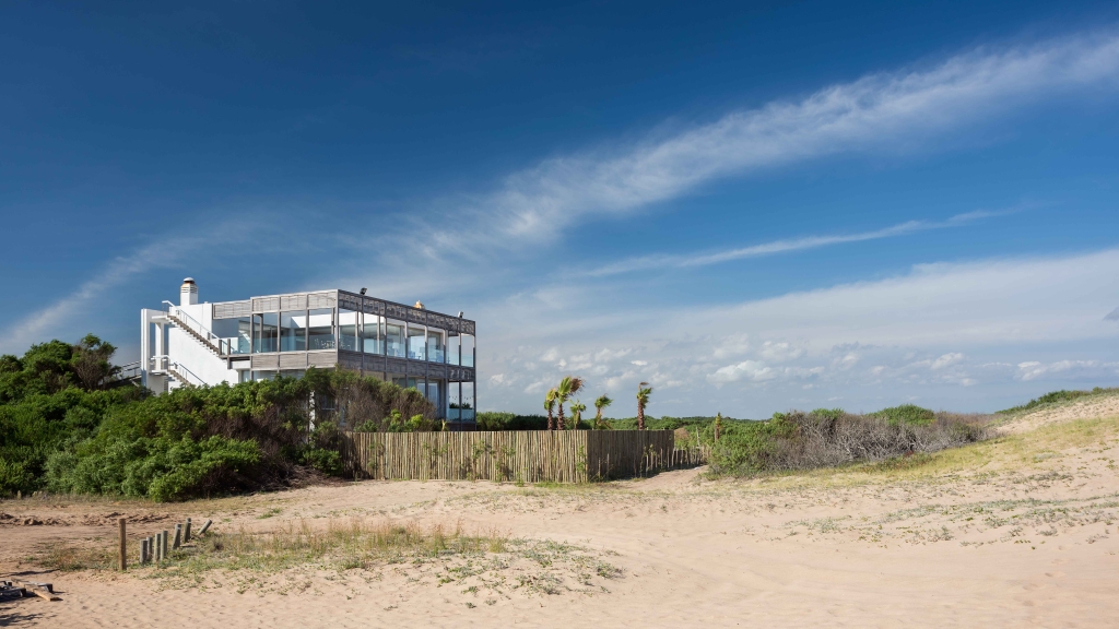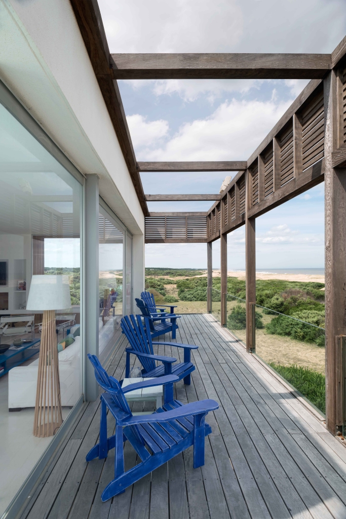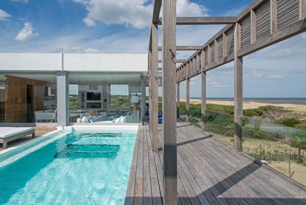 The modern, contemporary architecture simply links the large house with the rugged landscape of dunes and rough seas of this beach open to the Atlantic Ocean. The colors of the sand, the whites and the lapacho wood in its natural state are a perfect combination for this atypical beach house.