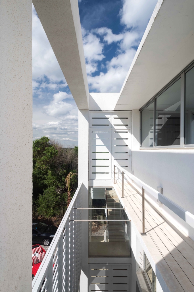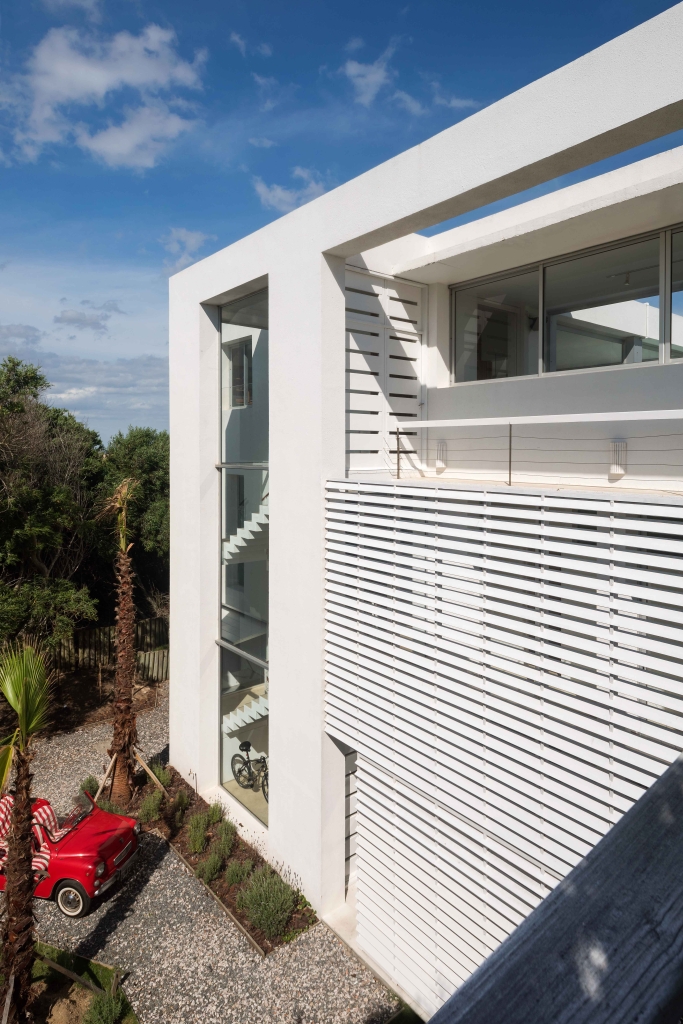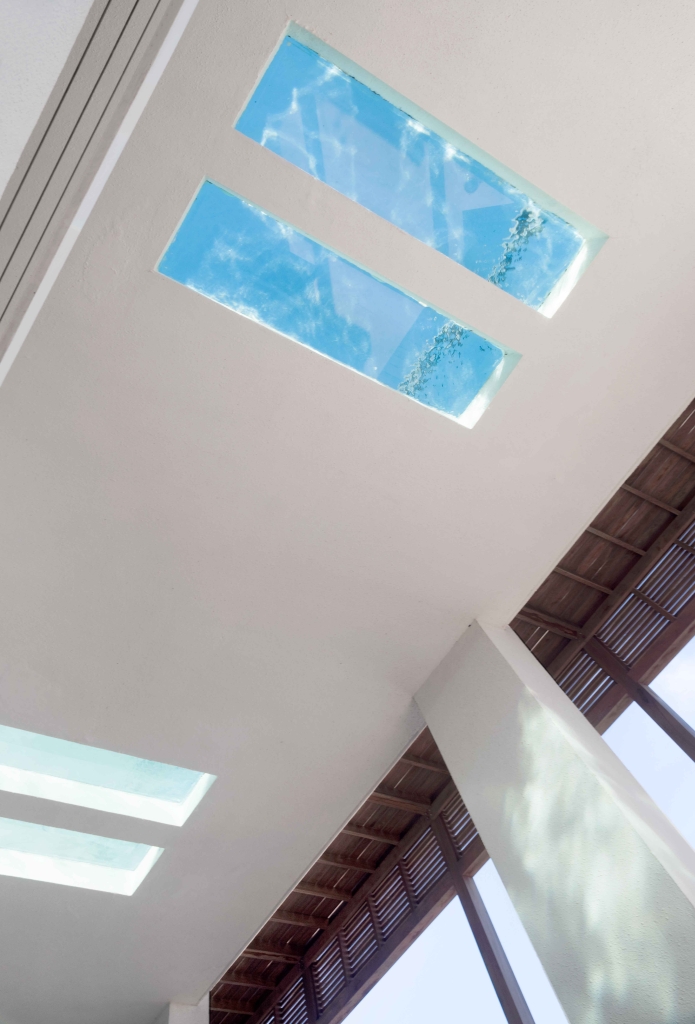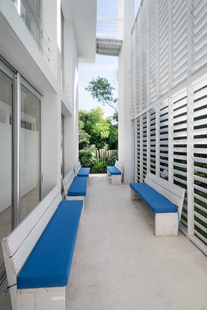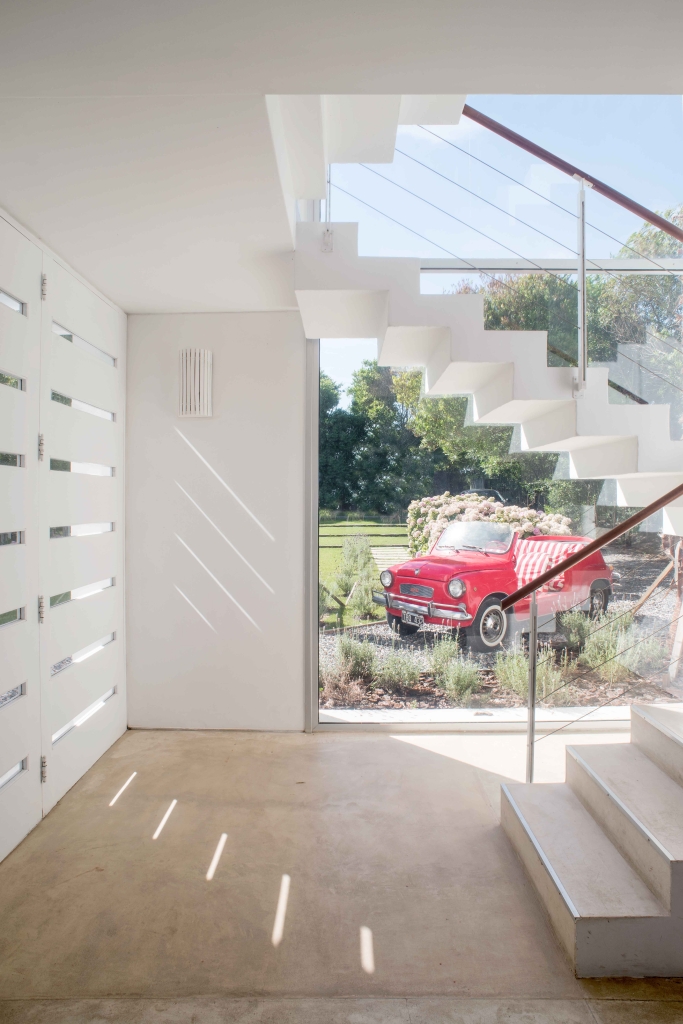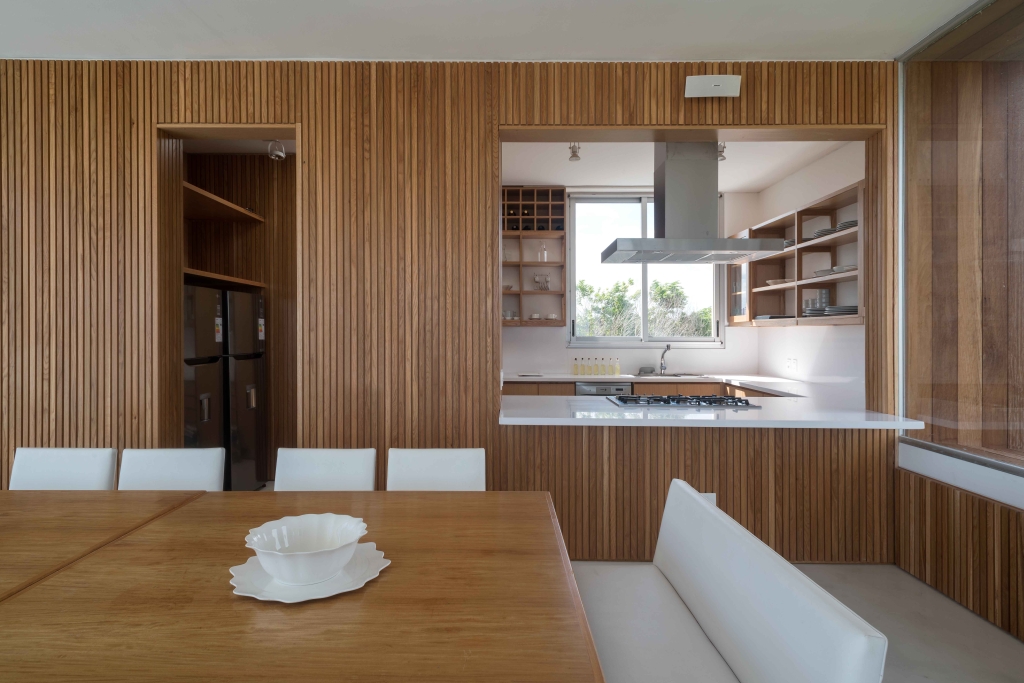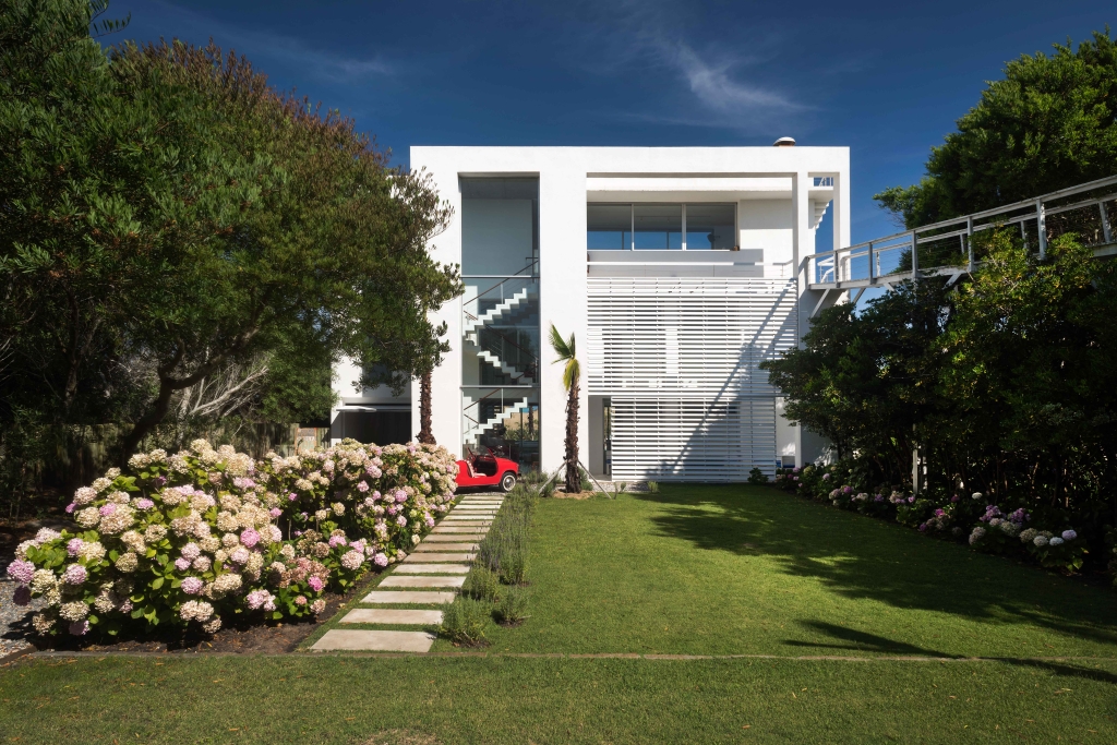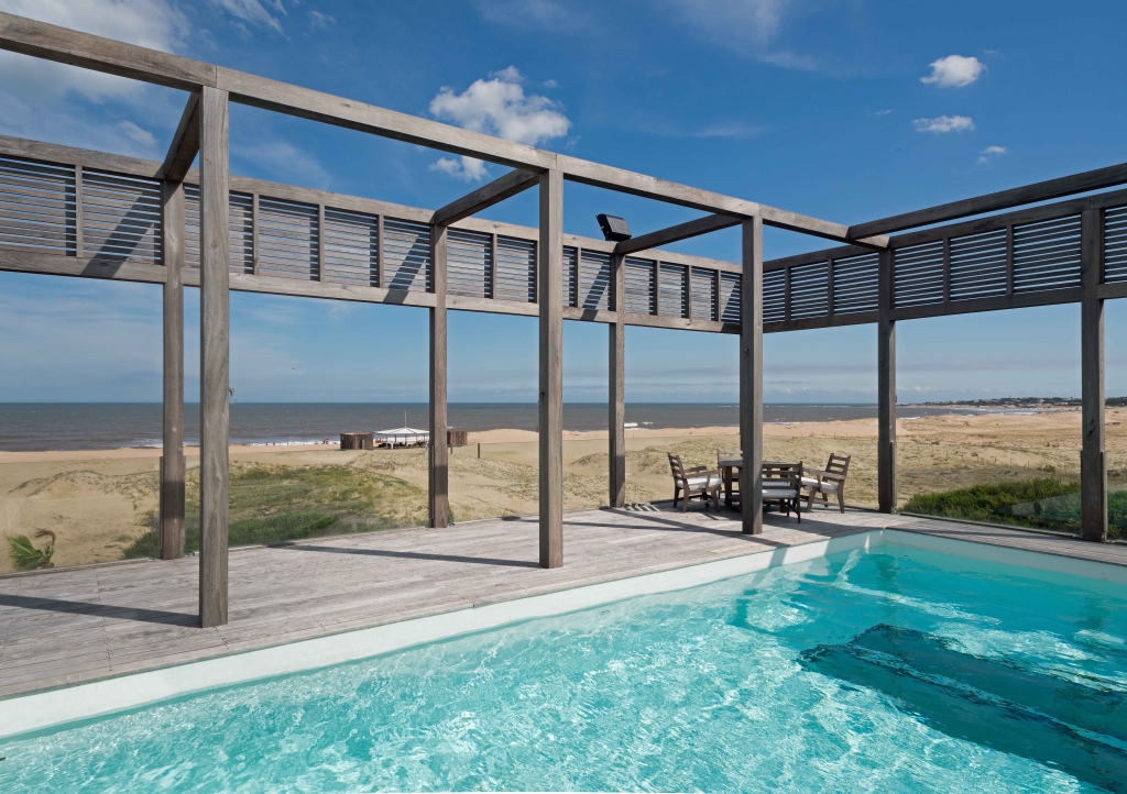 The house has three levels to be able to take the maximum height and obtain the best views of the sea and the town. On the upper level is the public area of the house which is accessed by a large wooden ramp from the garden. A large living room and a grill open onto a terrace with a pool, a space that we expanded substantially, organizing it with lapacho wood pergolas that provide great warmth to the environment. On the ground floor, the daytime life is divided into another area on the sand with a second pool and a relaxed design surrounded by plants typical of the east coast.