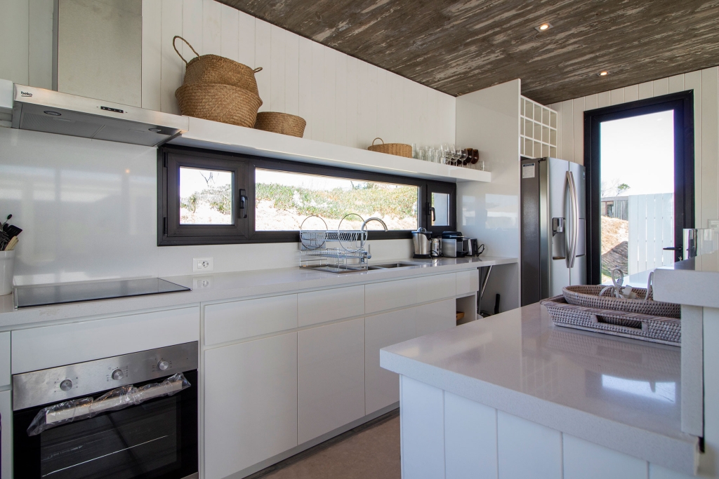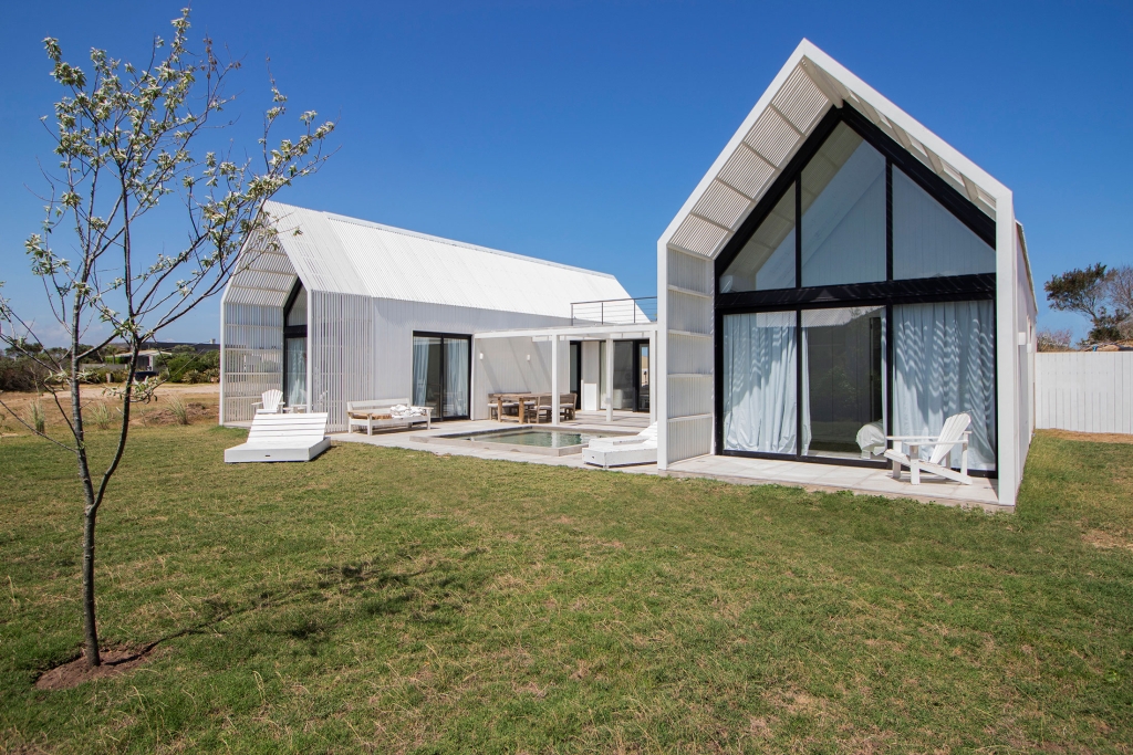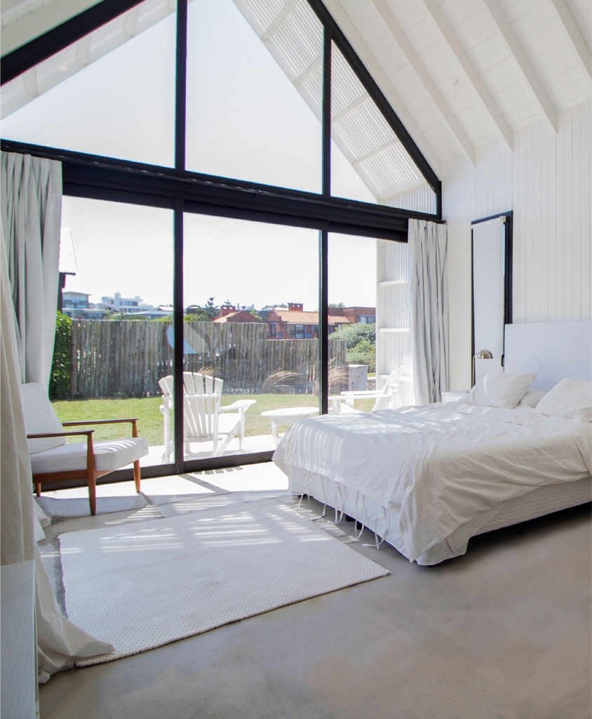 The house is developed on a U-shaped floor plan that opens onto a central patio with the best sun. The central part of the living room, dining room and kitchen has a structure and exposed concrete slab, with a plank texture and a flat ceiling. This public volume is contrasted with the lateral volumes, which are entirely made of wood, with a light sheet metal roof, a pronounced gabled roof and shelters the private part of the house: the bedrooms. The closure with large windows that occupy the entire height of the rooms allows infinite views of the garden and the sky from all these rooms.