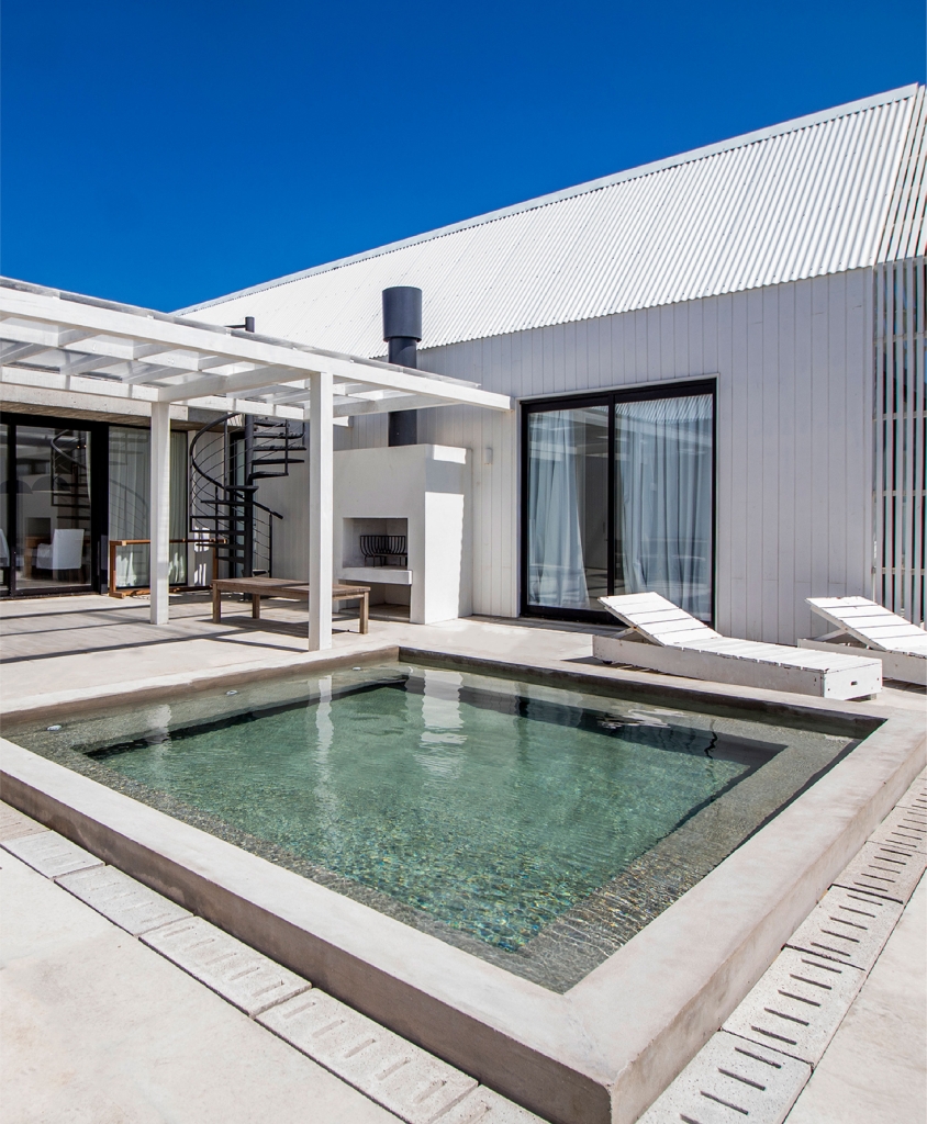 In the patio we place a square pool, a gallery with a pergola and a fire pit, which are the heart of this house. In addition to this, there is a large terrace over the flat roof volume with an incredible view of the sea.
