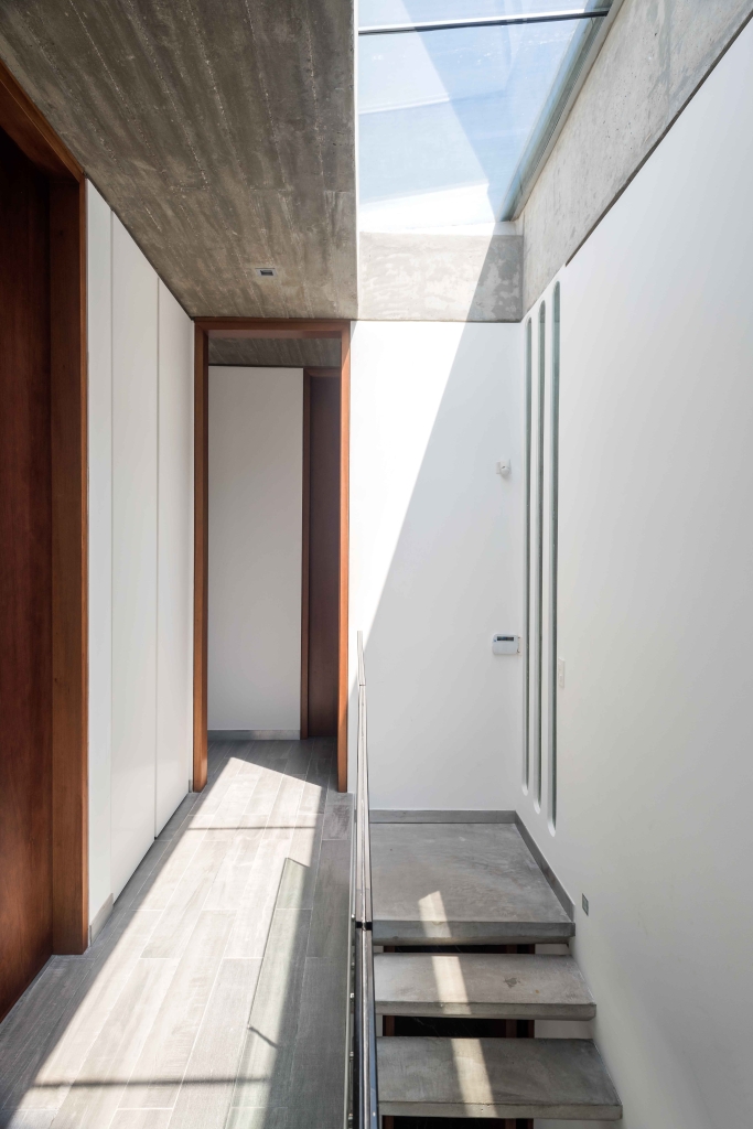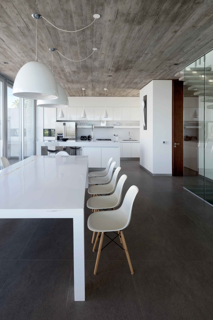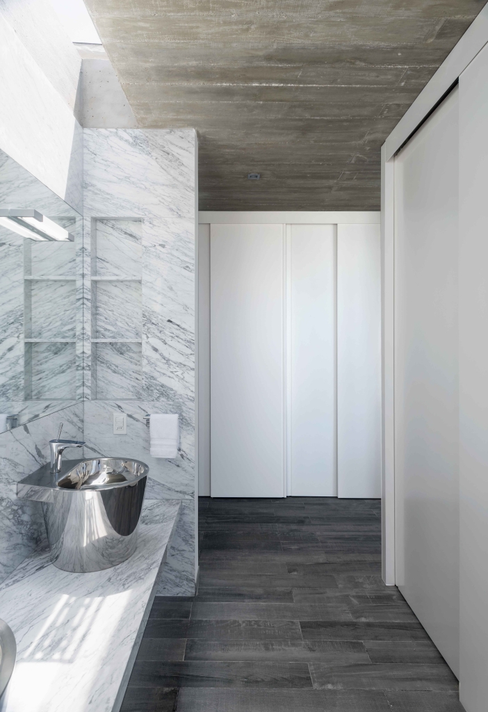 The house is accessed from the street which runs parallel to the sea, the most distant, entering through a large concrete portico which contains the door. This large grey prism, very closed towards the street and totally open towards the sea, is divided functionally into three very clear levels. On the middle level we find the living, dining room and kitchen, totally joined and connected to the courtyard/ swimming pool/barbecue, probably the heart of the house. On the upper level we find three main bedrooms and the en-suite which commands the ship on the glazed corner floating towards the sea. Each room has its own bathroom and its own wide views towards the sea horizon to the East. On the lower level we find two guest bedrooms, a large playroom with movie theatre, storage, laundry and service areas. The materials used give color to the house and the complex is only concrete and wood, to reduce maintenance.
