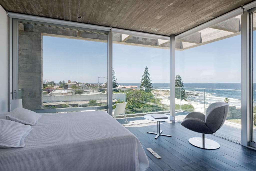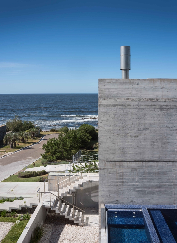 his project consists of two independent houses, one for the owners to use, and the other for renting out. Both exposed reinforced concrete structures, cast with brushed pine board shutters, articulate a courtyard with barbecue and swimming pool for the exclusive use by the owners of the house. The rental home has a swimming pool on the terrace with a seating area and a great view. The main house has been arranged on three floors with incredible views of the beach and the sea. The way the house opens through the courtyard/swimming pool, generates an unexpected relationship with the sea, because it has effectively brought about the penetration in this very attractive natural environment, making the house-beach connection sublime, even when they are separated almost 100 meters.