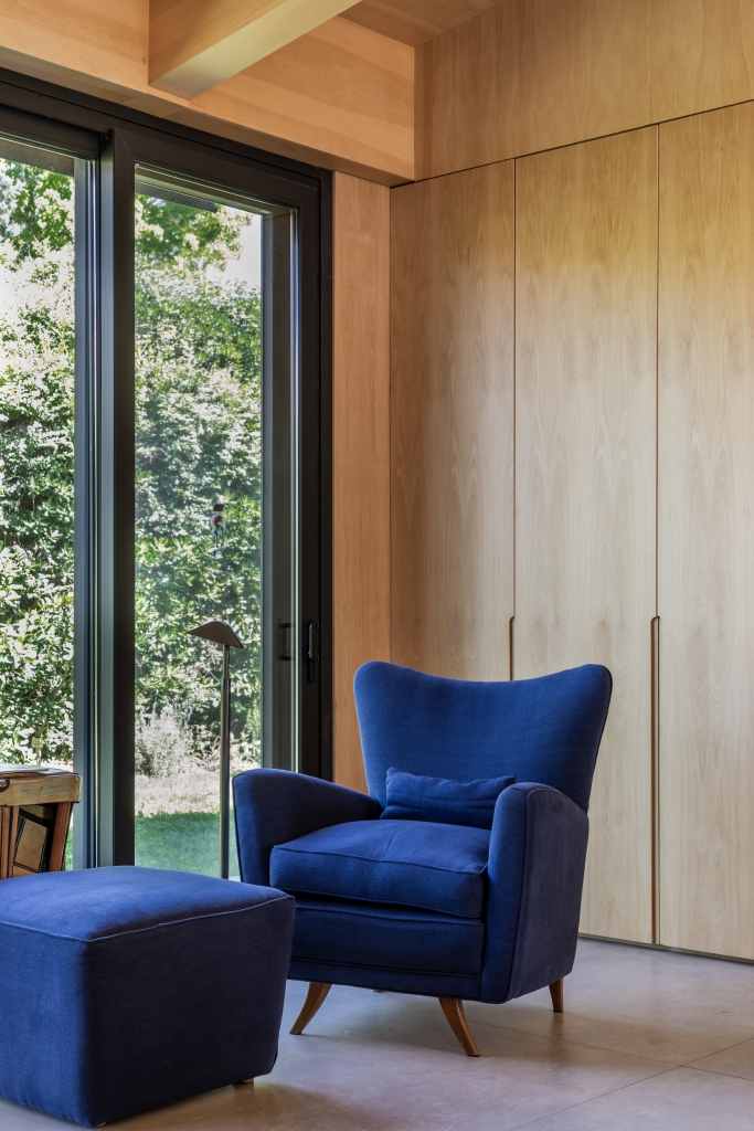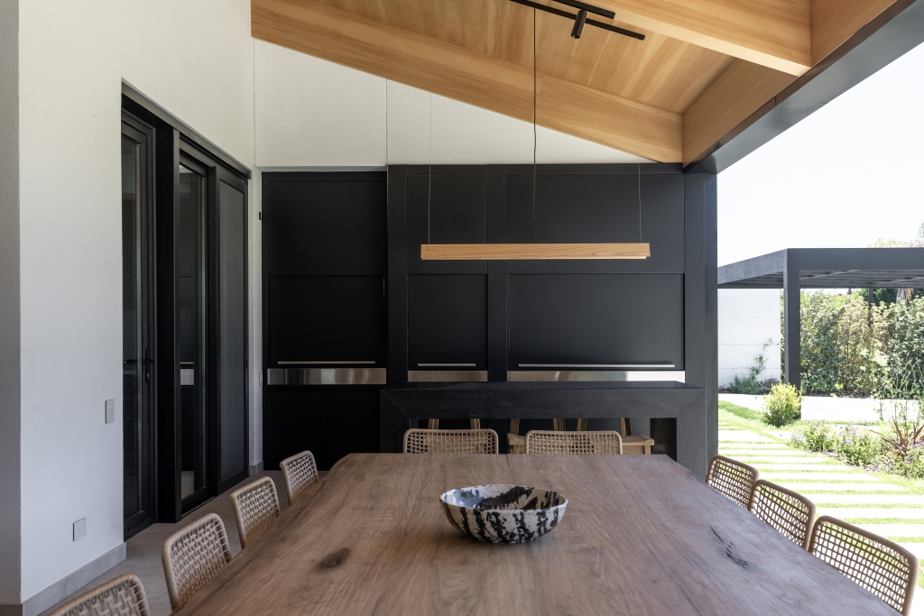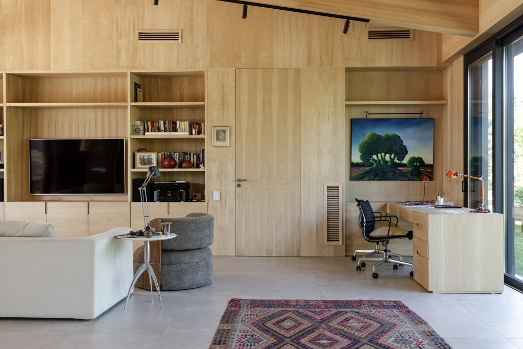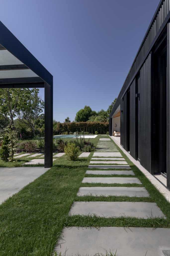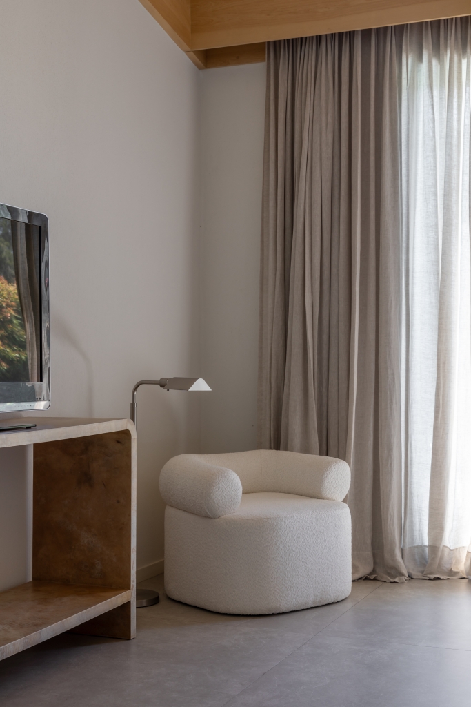 The project is organized around a clear scheme: a large central living-dining area, open to a gallery that directly connects with the pool and garden, functions as the core of daily life and a family gathering place. On one side of the volume is the master bedroom, conceived as a spacious and comfortable suite, with two full bathrooms and two separate walk-in closets, allowing simultaneous and private use by the couple. On the other side of the volume are two additional bedrooms, designed to accommodate the grandchildren during their visits.