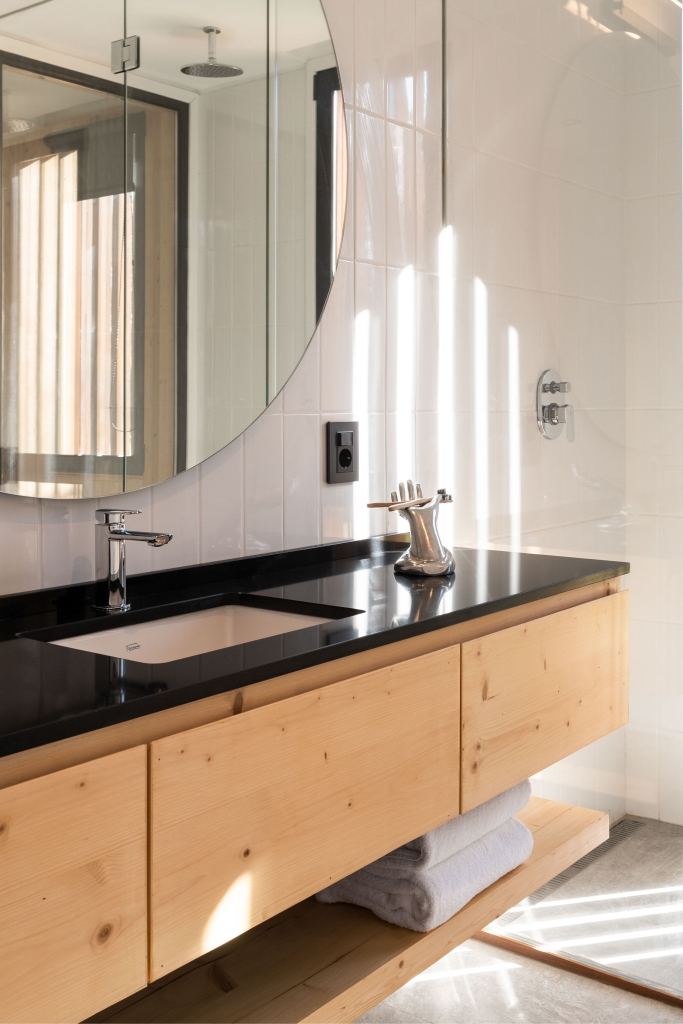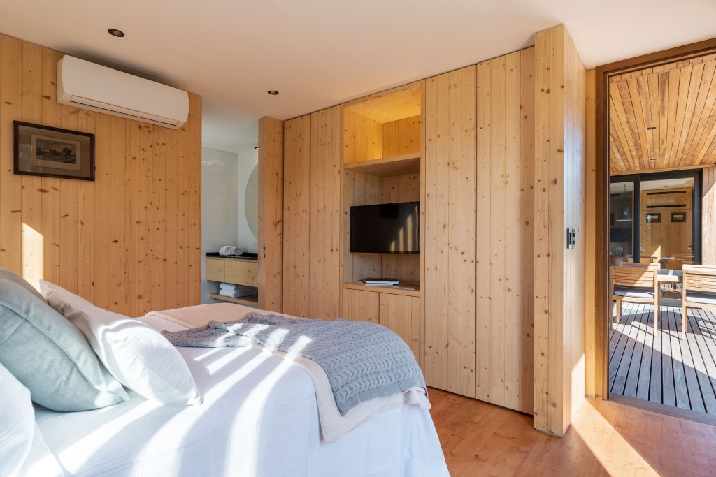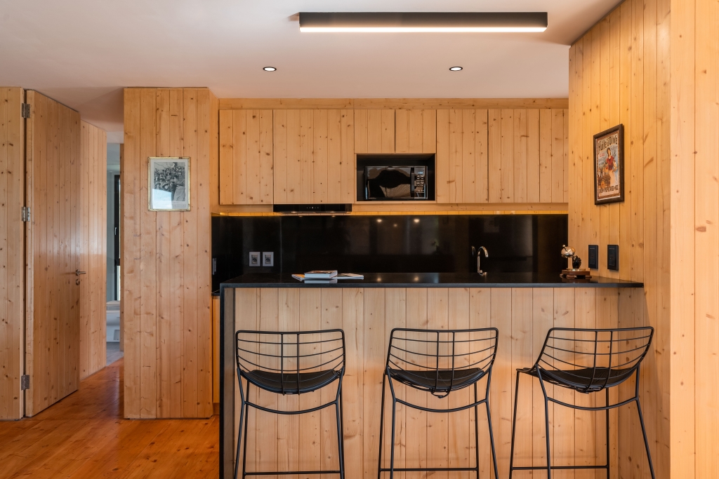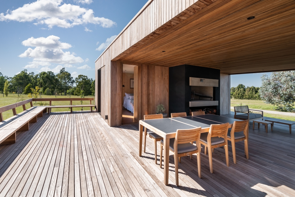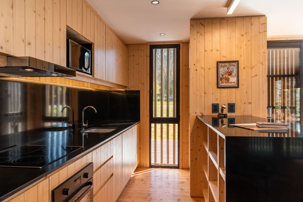 The largest volume consists of a living-dining room with a toilet and an integrated kitchen, forming the social area of the house. It connects to a large deck facing north and to the gallery sector that houses the barbecue. A master bedroom with its en-suite bathroom is added to this main volume.