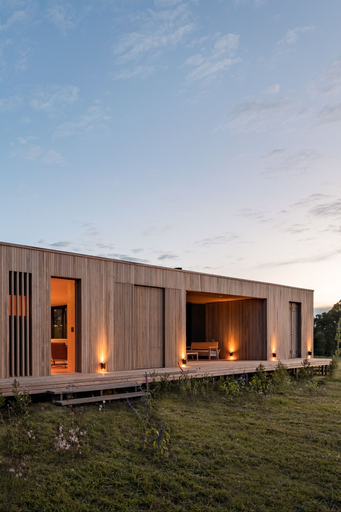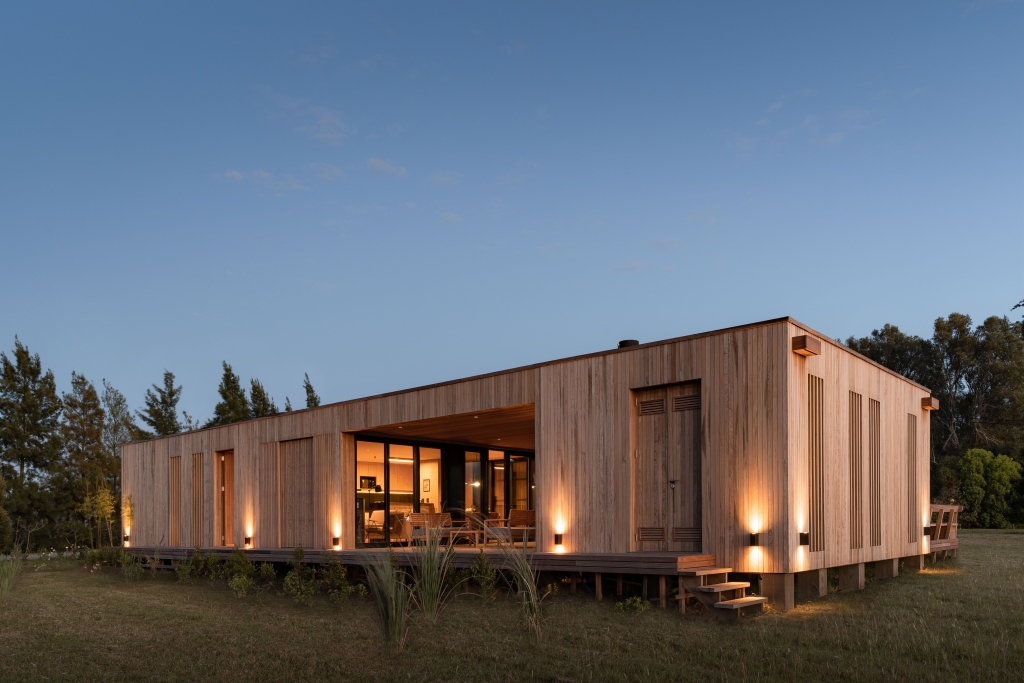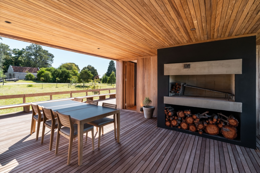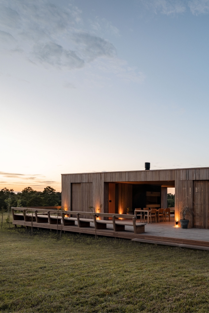 Referring to the centuries-old forest and the color palette of the field, the exterior walls were covered in natural lapacho boards placed vertically and fully covering the total volume.
