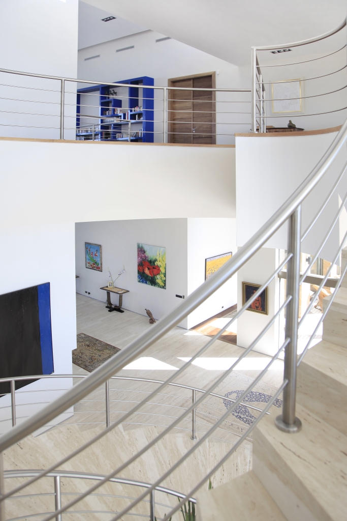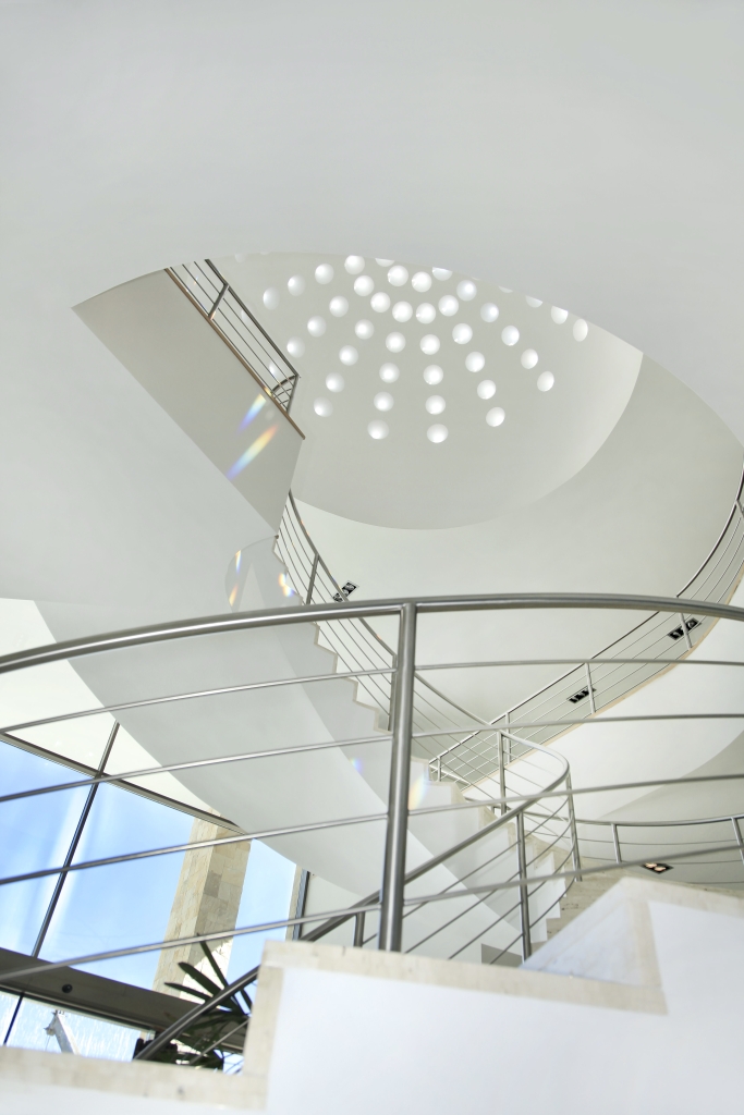 The project highlights a steel and marble staircase that is crowned by a perforated dome that is set in a rubber seat with glass cut by swarovski in the shape of diamonds that decompose natural light into incredible colors.
