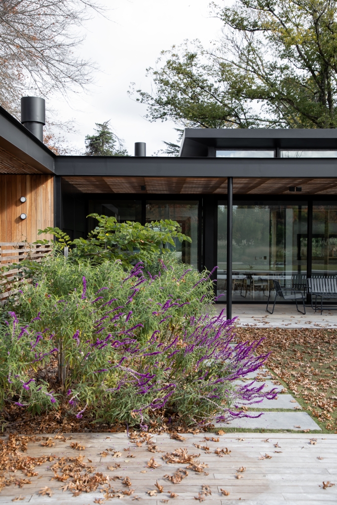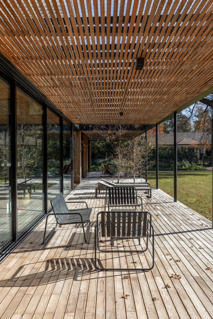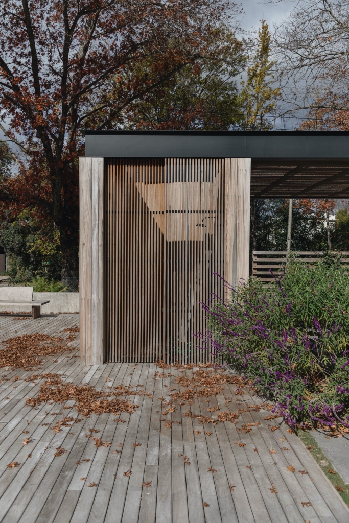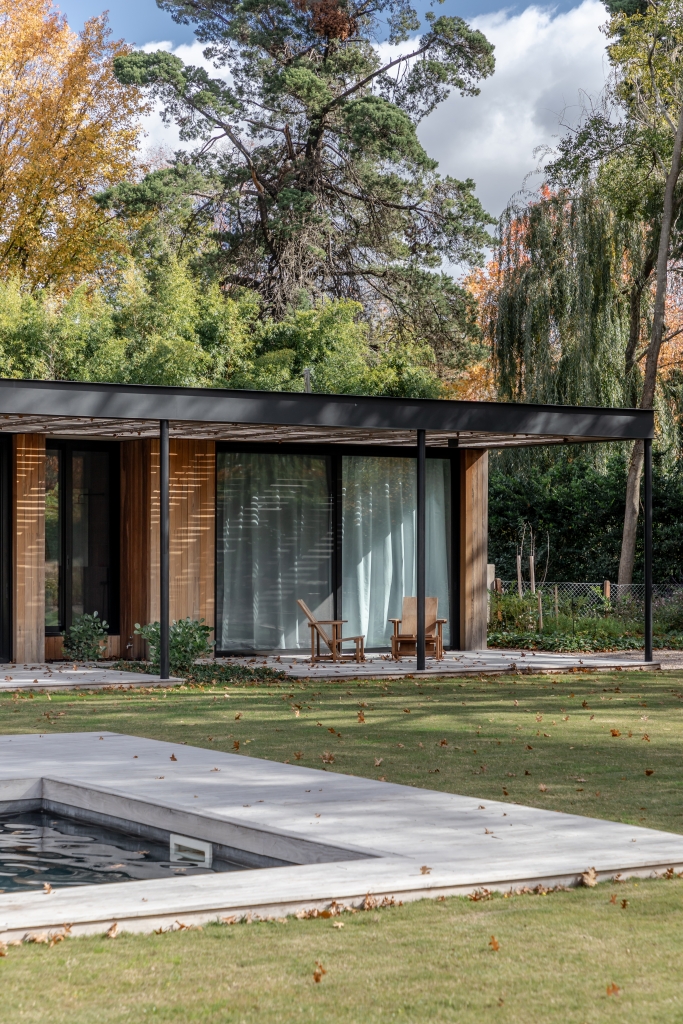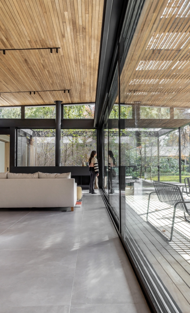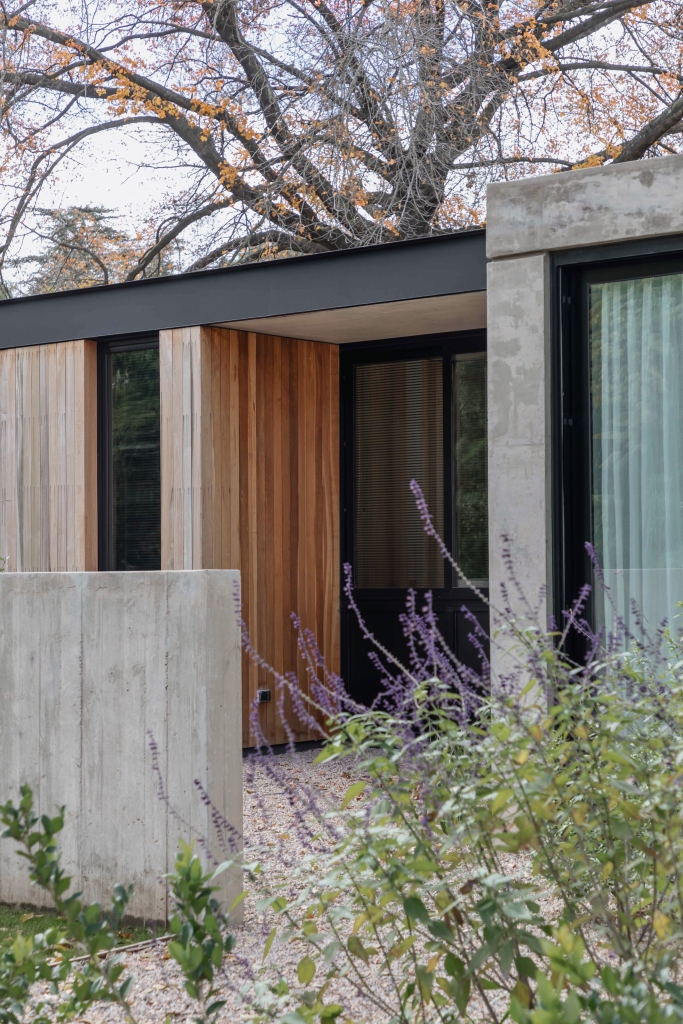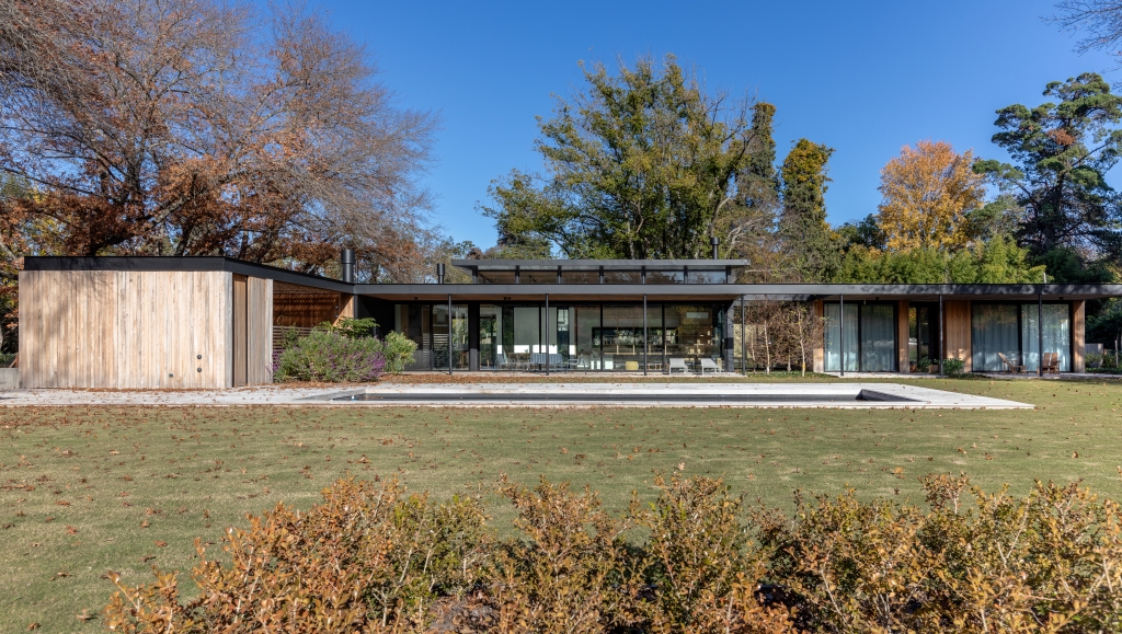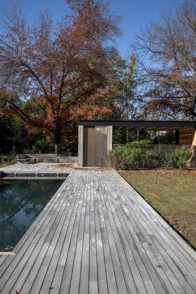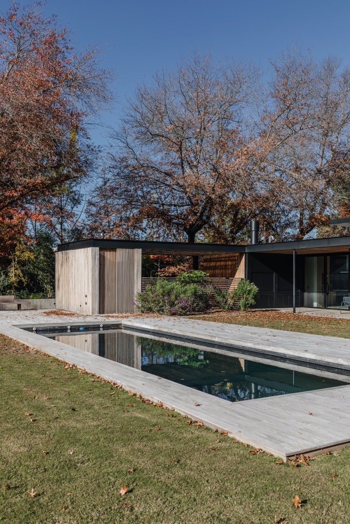 Materials were carefully selected to harmonize with the landscape: untreated lapacho wood was used for exterior cladding, as well as for pergolas, fences, and decks. Exposed concrete and black-painted steel define the visible structure, providing a refined contemporary contrast. The pool, lined with a dark material, acts as a mirror reflecting the surrounding trees—evoking the image of a lake immersed in nature.