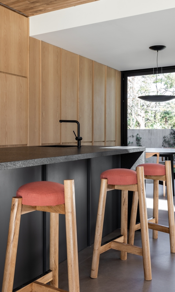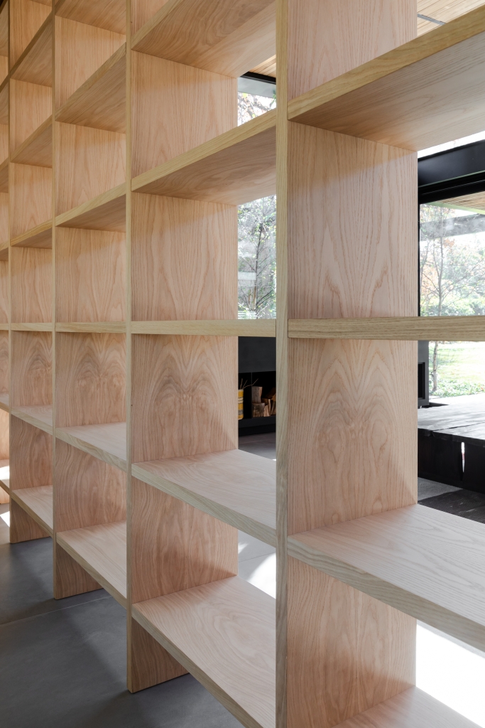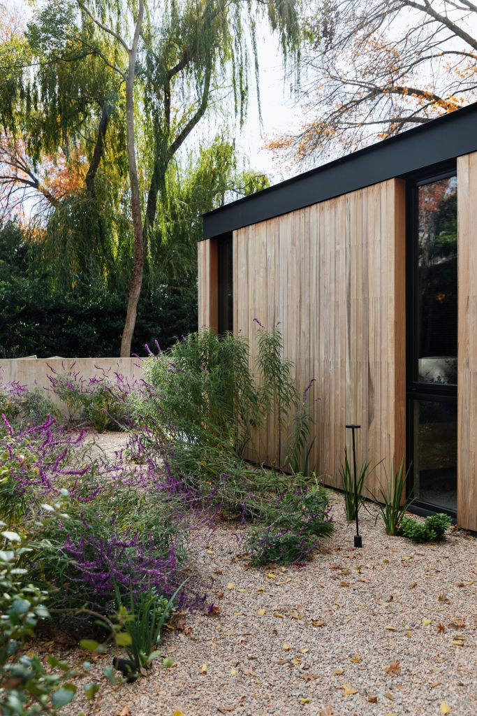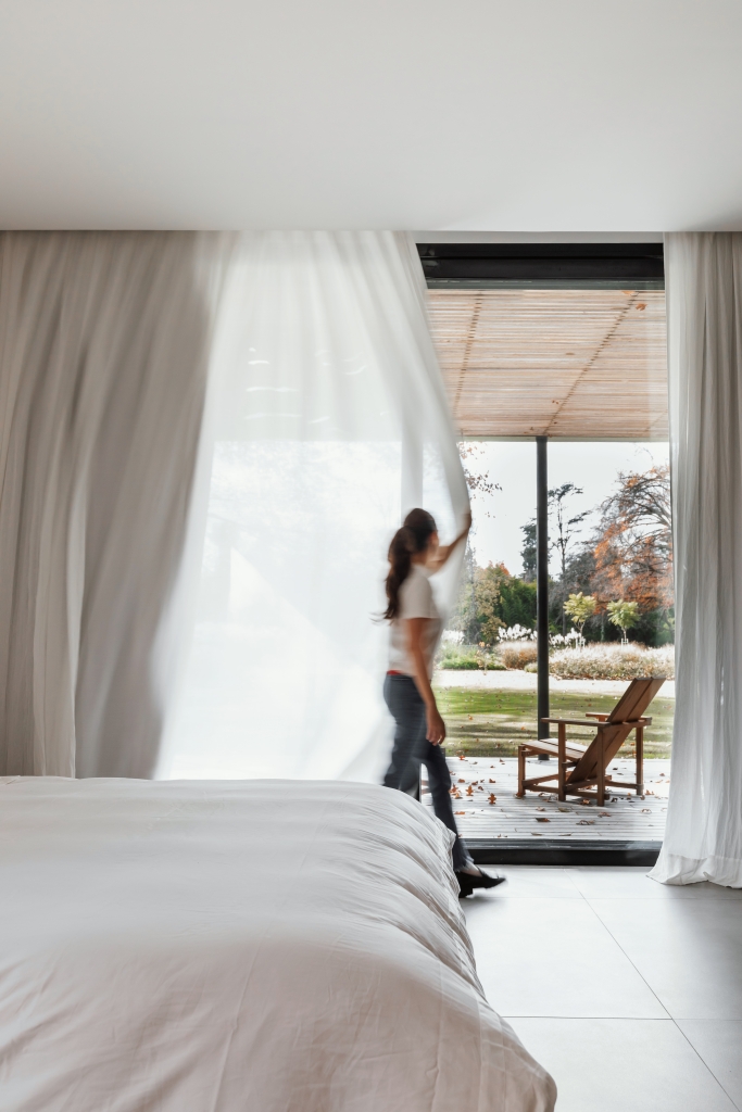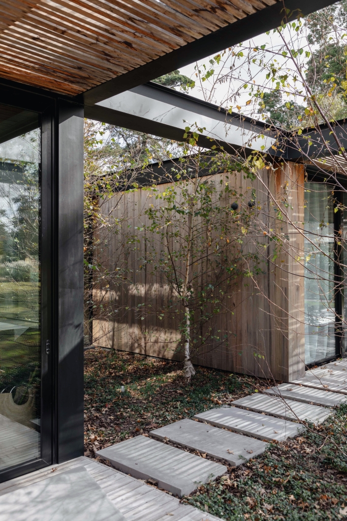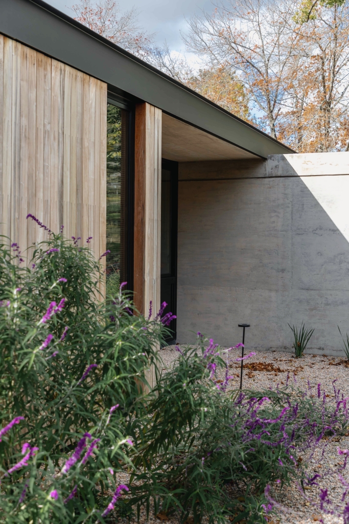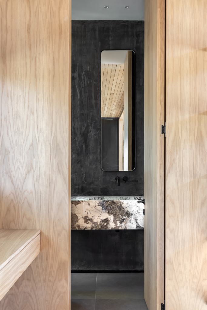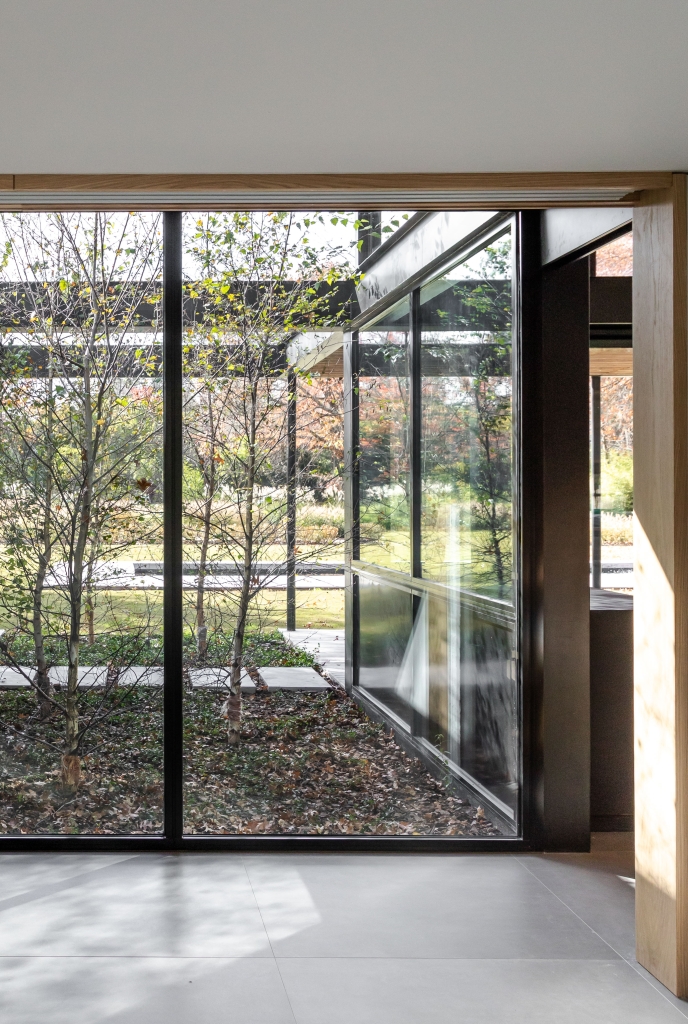The slab features three strategic openings that create interior courtyards and incorporate nature into the living space: one with three birch trees visible from the living room; another serving the laundry/tender area; and a third located above the pool shower, offering direct views of the sky and surrounding oak foliage.