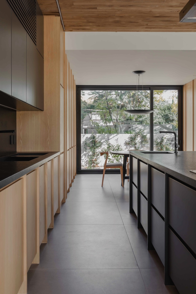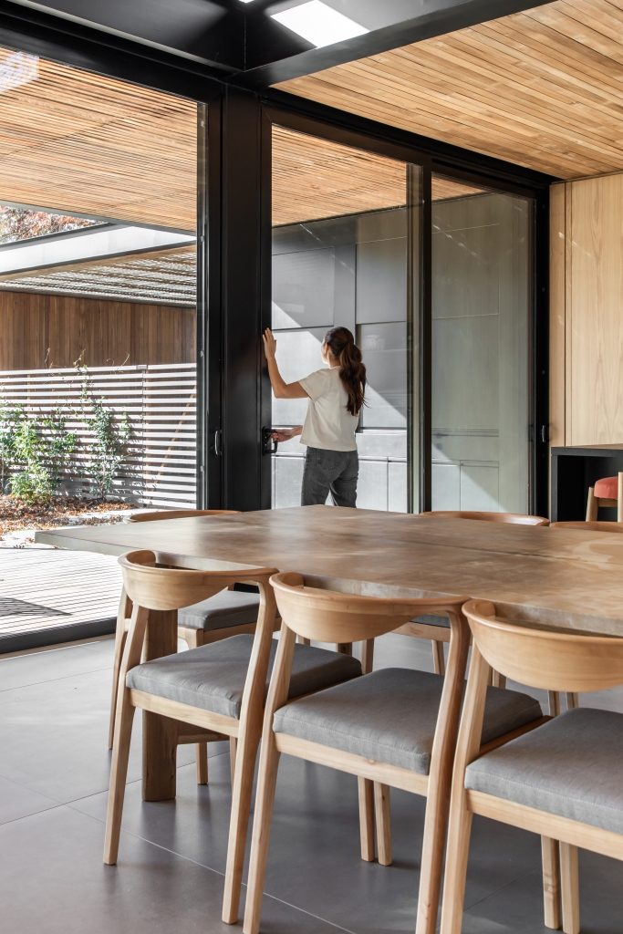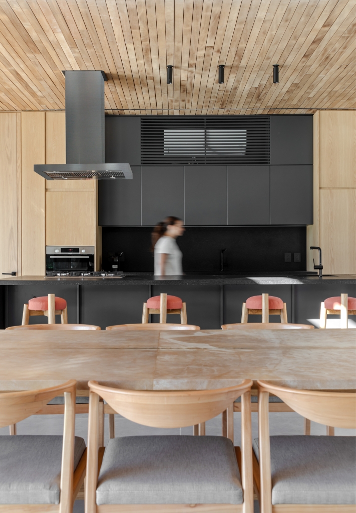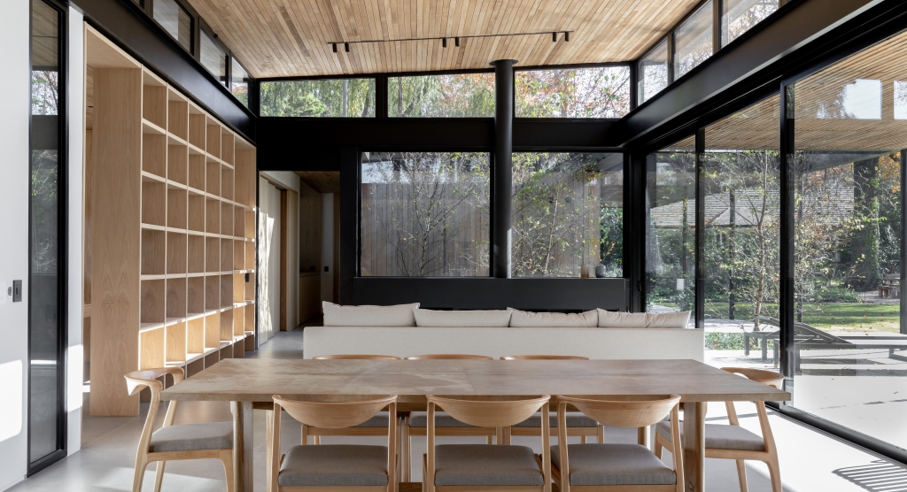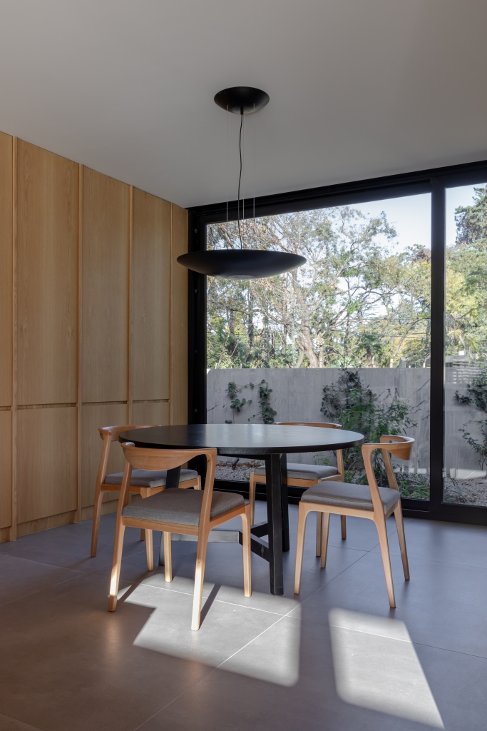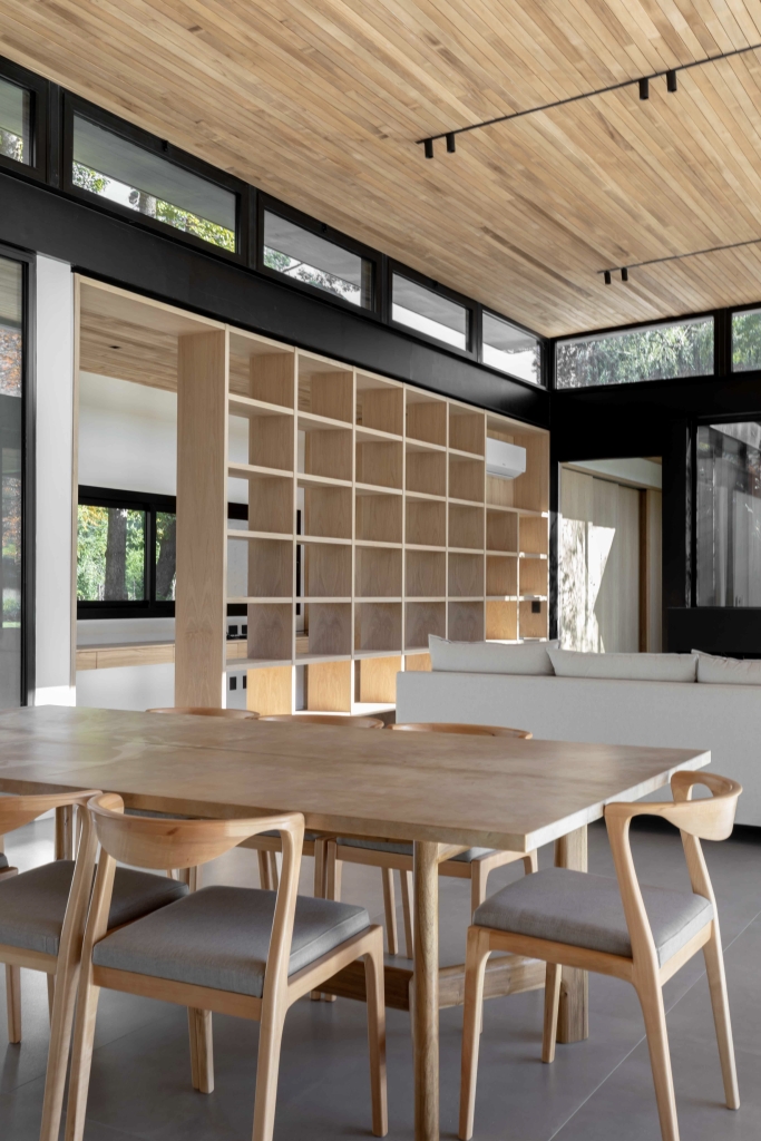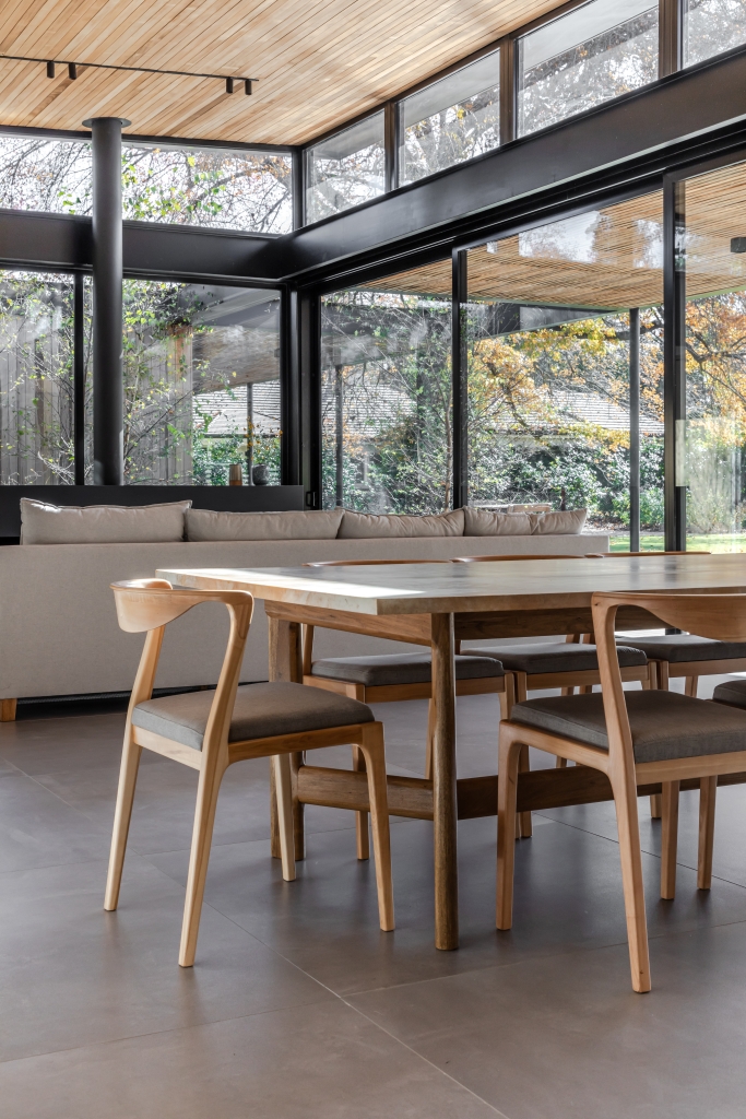 The living room is one of the home’s most prominent spaces: horizontally oriented, with large windows offering spectacular views of the garden. This area integrates seamlessly with the dining room, kitchen, and daily dining nook. Above it, a sloped roof rises, supported by a metal structure and skylights that not only enhance the sense of spaciousness but also allow abundant natural light to flood the space.