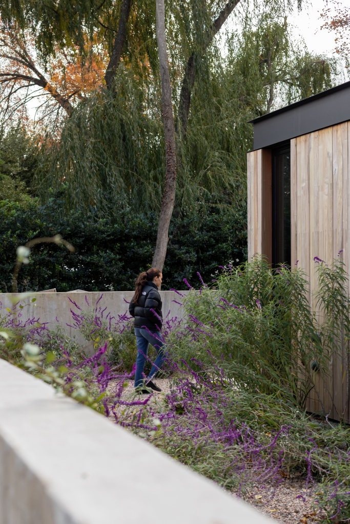 The front façade is defined by exposed concrete walls formed with 1.2-meter-high vertical board formwork, which extend up to the front setback line. This design solution creates a garden that is visually shared with the surroundings, an intermediate space between the concrete wall and the façade, and a central garden projecting into the heart of the plot—encouraging natural airflow and daylight penetration.