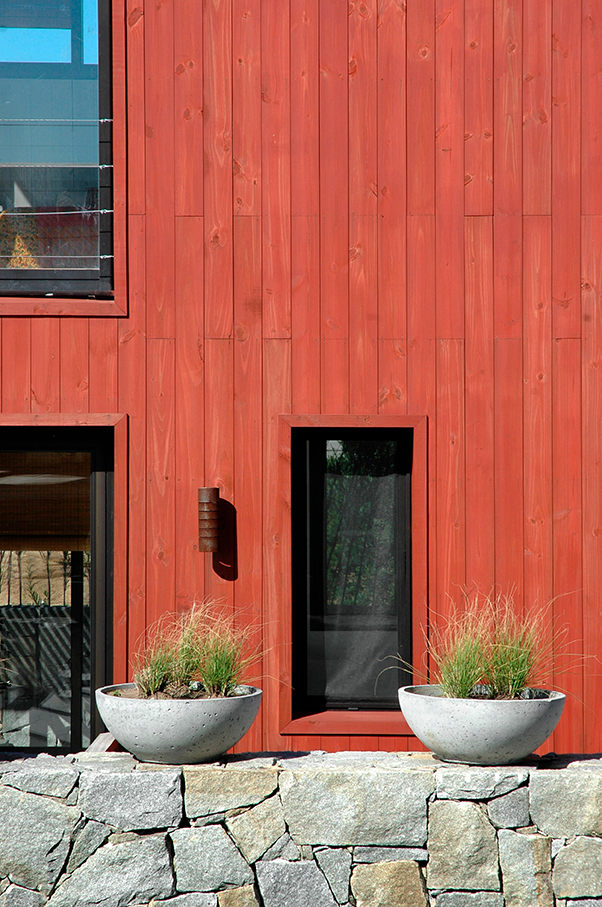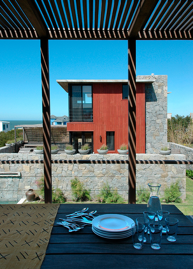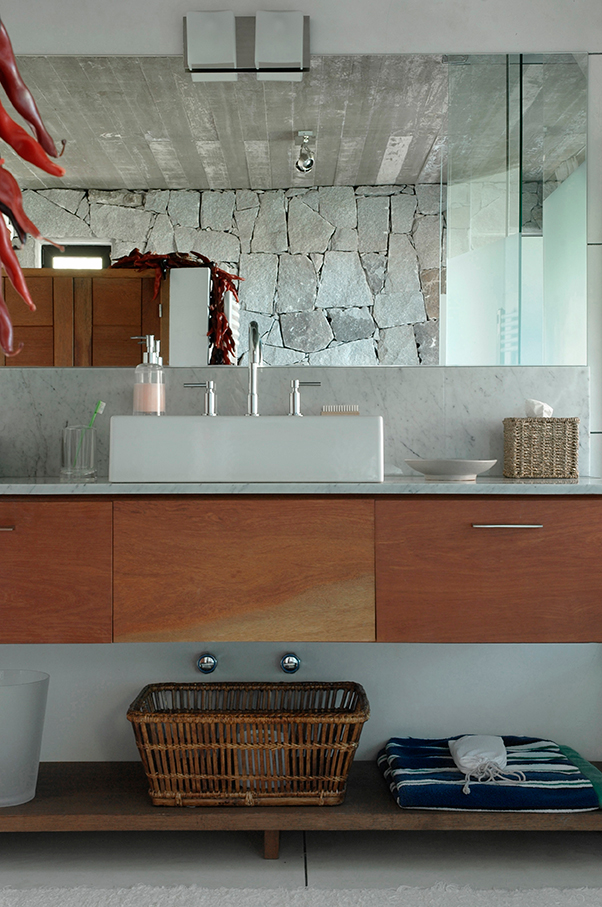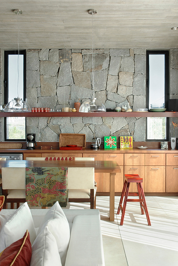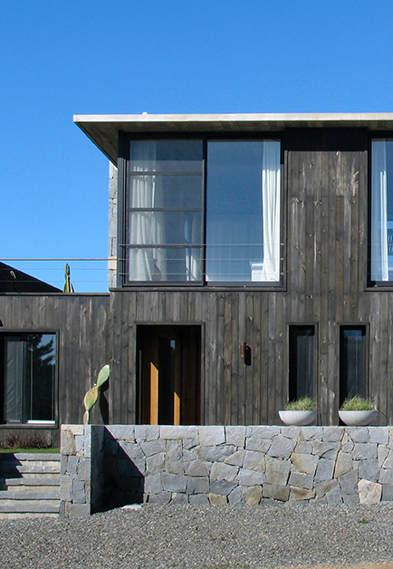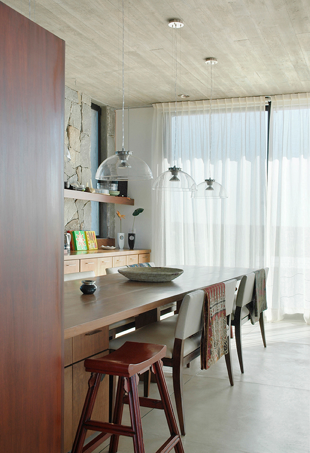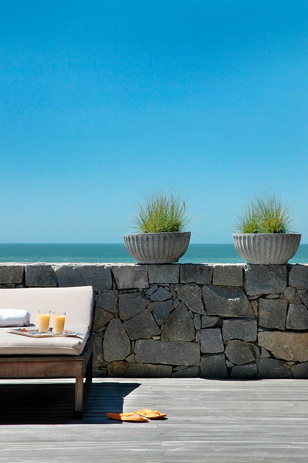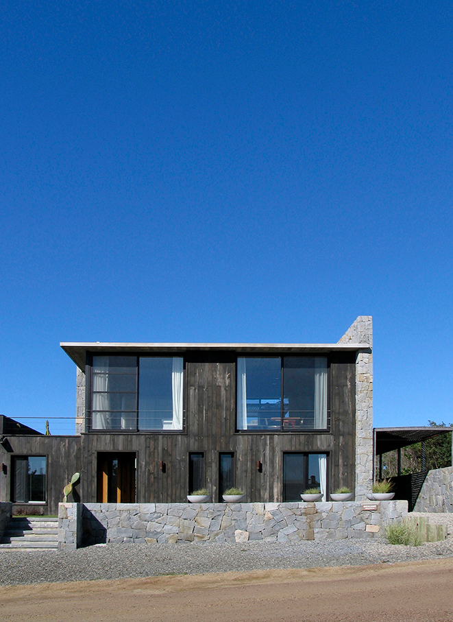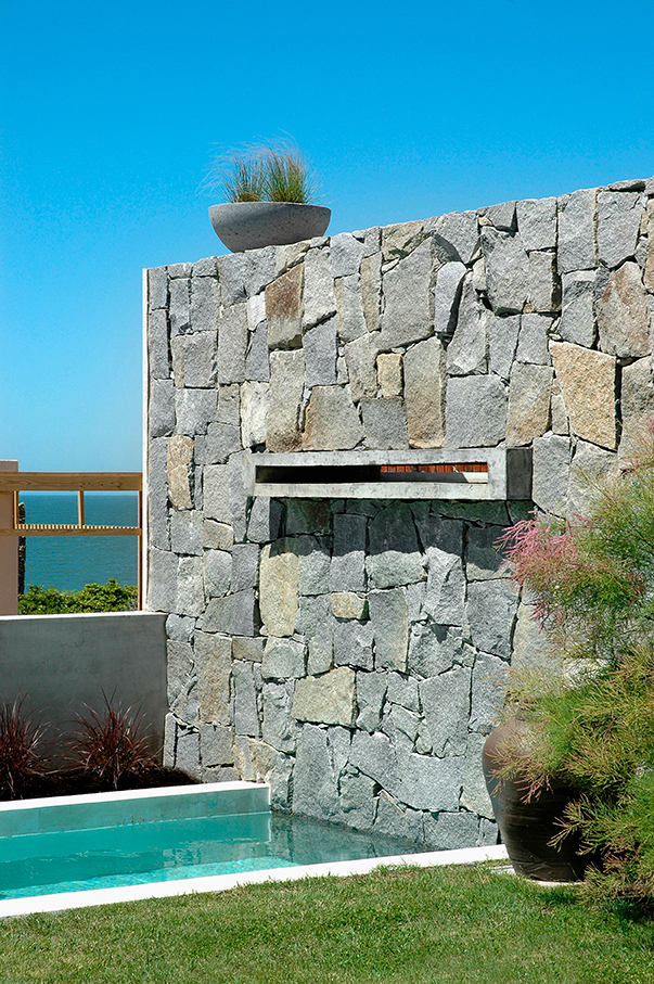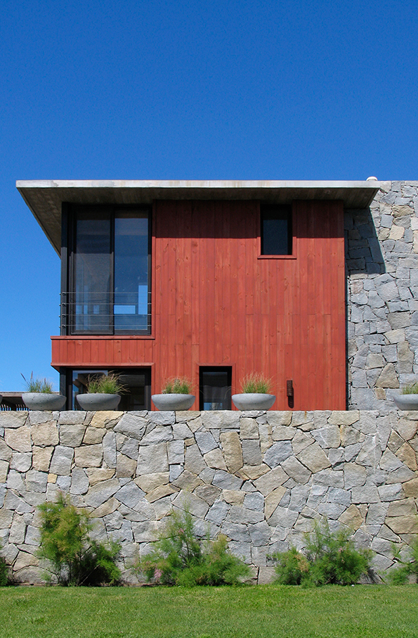 The materials were chosen for their resistance to the corrosive ocean air, leading to lower maintenance costs. The focal point is thus divided between stone and wood, both complemented by concrete and glass.