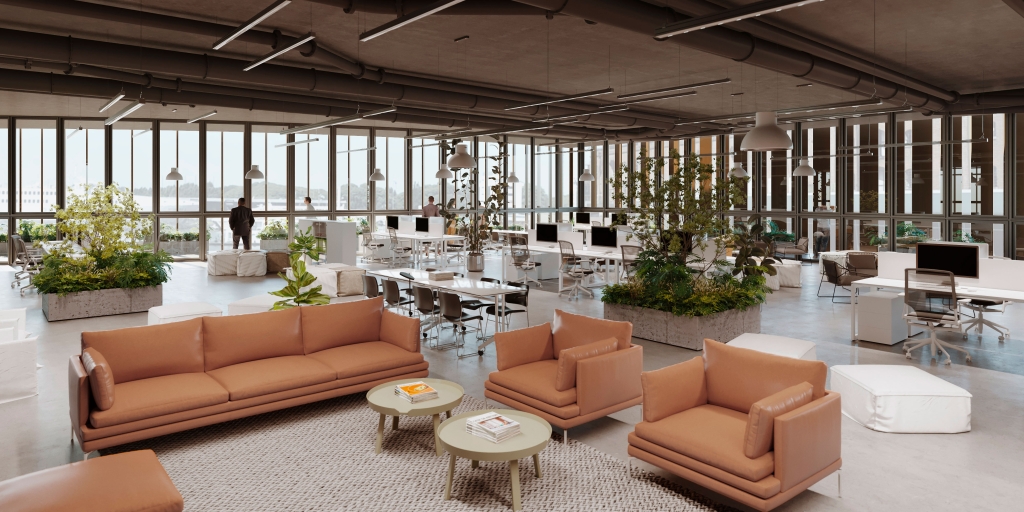 The design features a sober, contemporary envelope with glazed façades that allow for natural light and visibility, along with solar control elements to optimize thermal performance. This technological image is complemented by spacious, well-lit interiors that enhance the spatial experience and promote comfort in a high-density work environment.