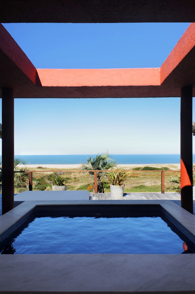 The sides of the U-shaped house are the guest quarters on the left and the spa on the right. The central module contains the entryway and the open-concept living areas, which are only interrupted by the sculptural circular stairway leading to the two wooden wings that house the main suites.