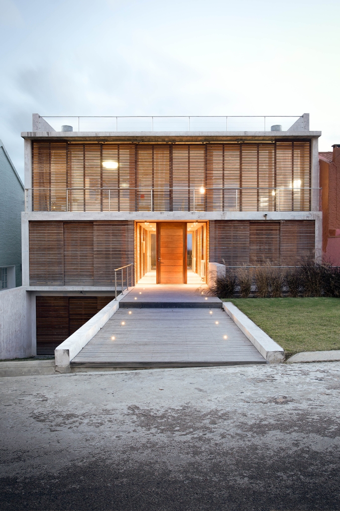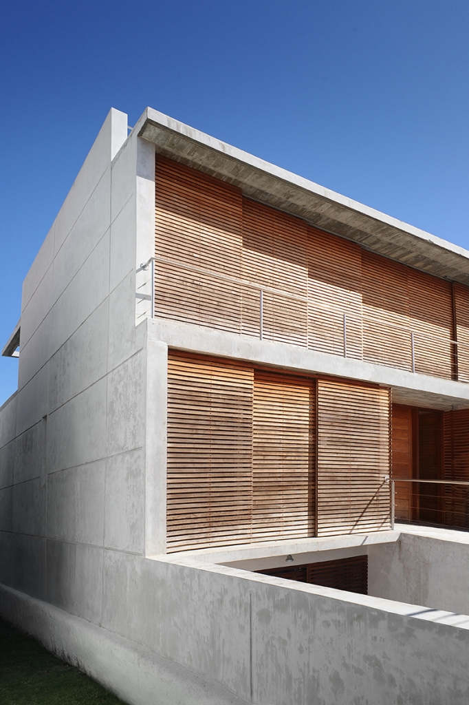 These two apparently contradictory concepts, protection and openness, are quite common in contemporary architecture, which tends to offer them both through the design of the building’s outer skin. In this case, the solution was shutters made of wooden slats to protect against sunlight and prying eyes, yet the shutters were designed to slide so that they can easily be opened and closed.