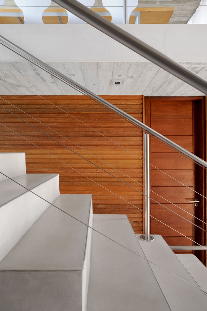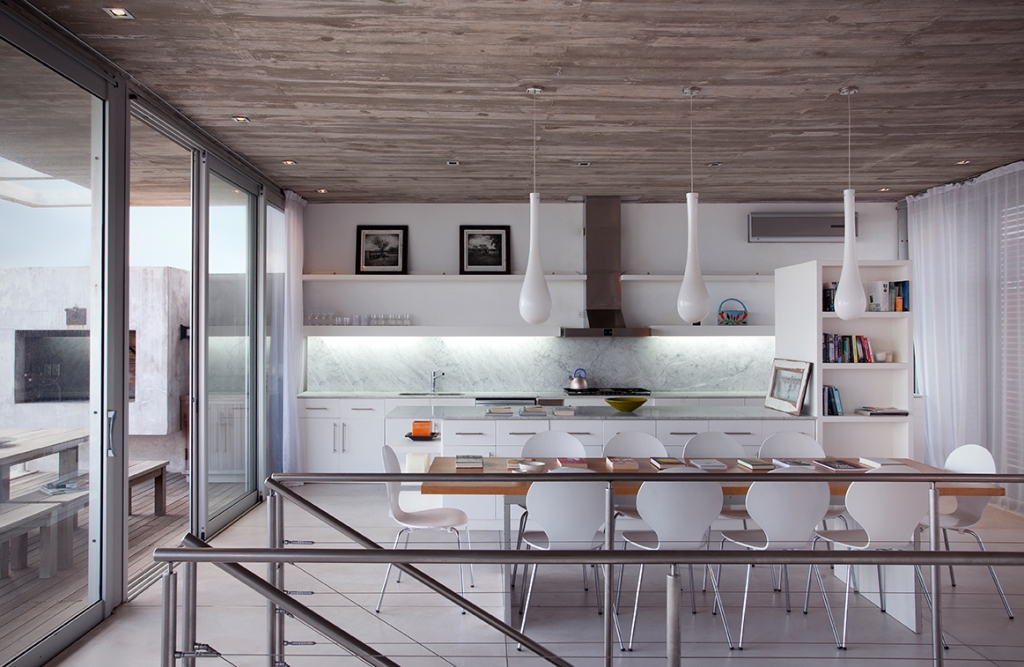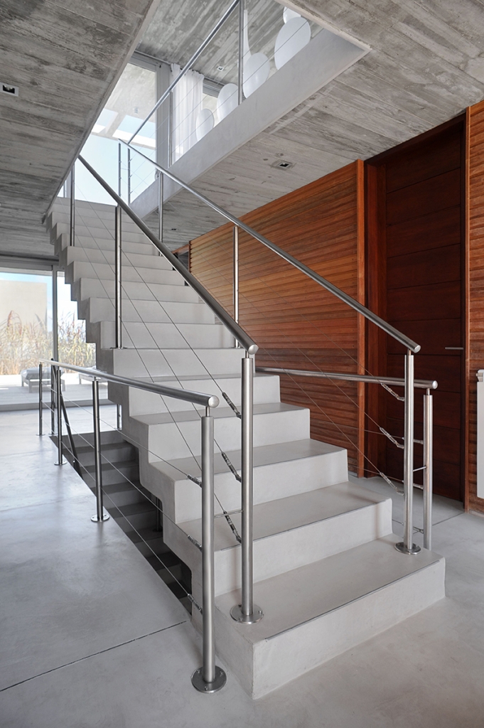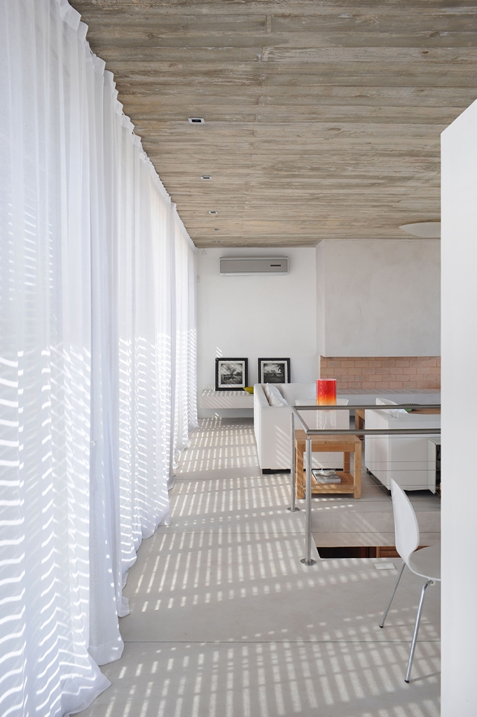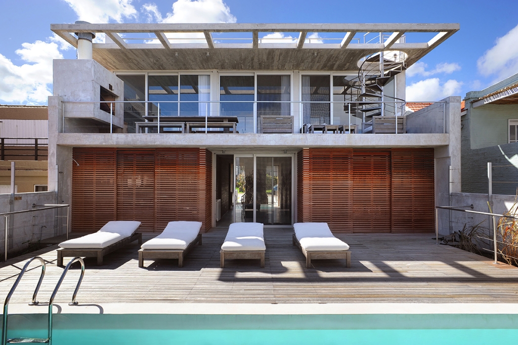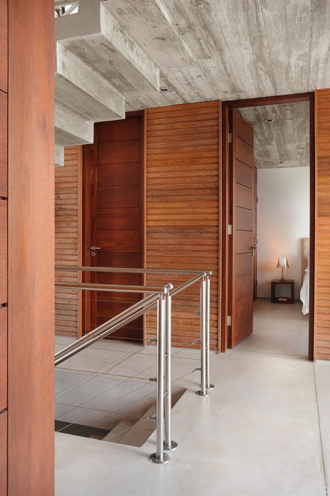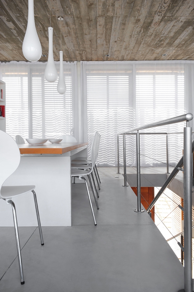 The attic was designed as yet another wood-clad room with steel banisters where the residents can enjoy the outdoors and especially watch the incredible sun setting behind the skyline of Punta del Este.