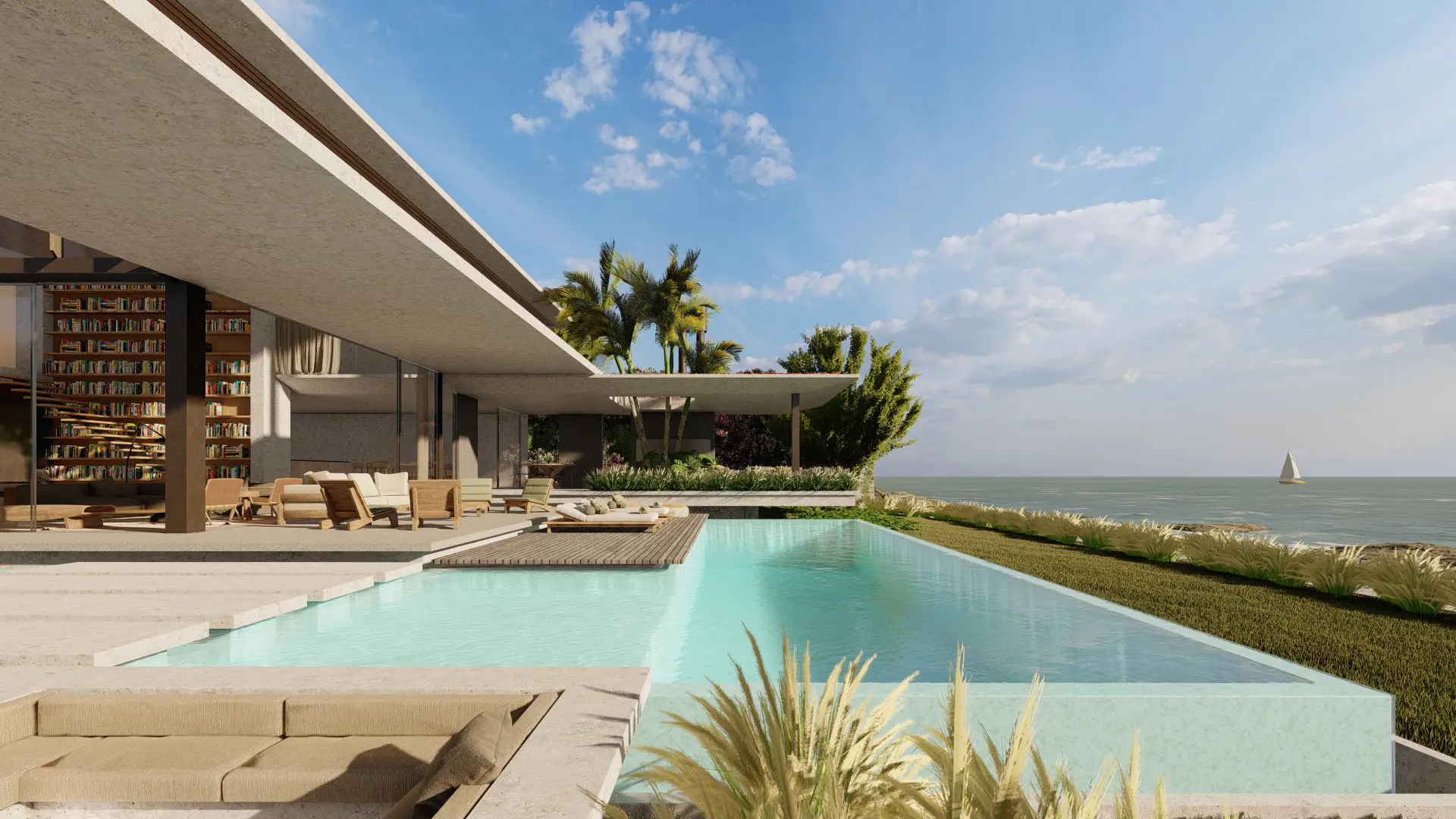 The architecture unfolds through large, parallel planes of exposed concrete — bold yet perceived as light thanks to their proportions and the suggestive transparencies that filter through them.