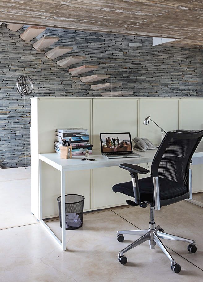 The practical materials are reinforced concrete, whitewashed plaster and grey-coloured stone, with no further embellishment than the materials’ natural colours. The stone has been carefully considered and placed lengthwise to enhance the spectacular appearance of the dynamic spaces. This concept materialises in a vertical exterior wall located crosswise on one side of the building and accentuated by the natural beauty of its stones, which contrast with the white paint on the rest of the facade. The horizontal windows are transformed into vertical strips as they approach the stone wall, which in turn contains a large circular window.