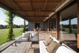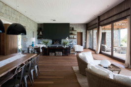 Nunca quisimos perder la idea de casa de campo. Por eso, pensamos en que fuera recorrida por largas sombras de pérgolas de lapacho y ornamentada con Santa Rita de color fucsia. Los materiales utilizados fueron pocos, sólo el hormigón y los tablones de madera antigua, rescatados de un convento del Sur de Brasil, que le dieron a la obra el carácter de lo usado y de la buena vejez, más la piedra de granito que aporta su fortaleza y la convierte en una casa con muy bajo mantenimiento.