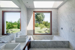 Teniendo presente las increíbles vistas al lago y a la campiña, se acomodaron los cuerpos de los ambientes principales para que todos tuvieran vistas de primera. Estos ambientes debían salir a un jardín en el nivel de los solados interiores y, para ello, se levantó un muro de piedra contenedor de una gran plataforma verde que generó un desnivel donde se ubicó la zona de la pileta y la parrilla. Esta plataforma, de alrededor de una hectárea, hizo que la casa descanse sobre suelo firme, equilibrando el nivel de “tectonicidad” del gran volumen de piedra.