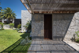Se accede a la casa por un generoso cortijo que contiene espacio para autos, similares a los utilizados en las estancias para los típicos y antiguos carruajes. El juego armonioso de volúmenes monolíticos de granito van organizando estos patios con la ayuda, además, de grandes muros del mismo material.
