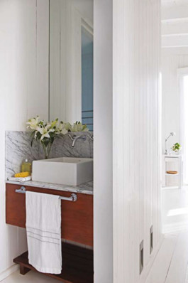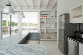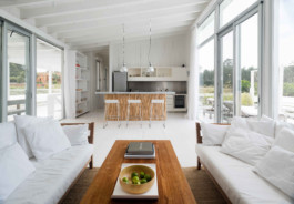 El interior no destinó espacio al comedor. La mesa de comedor está solo en el exterior, sobre el deck techado. En el interior tan solo una barra en U con doble altura donde se combinó mármol para la mesada y caña para la base. En el deck exterior una larga mesa construida en lapacho, con bancos con respaldo diseñados para extender la sobremesa y por supuesto, un parrillero con vista a los mágicos atardeceres uruguayos y protegido del viento del mar.
