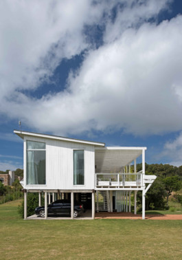 A 600 metros del mar, con vista al este y al oeste, nos encontramos con este terreno con mucho desnivel, atravesado por un pequeño arroyo que va serpenteando todo el terreno guiando la recolección de agua de lluvia que viene bajando de los campos y desembocan al océano atlántico. El lugar perfecto para esta casa sobre pilotes.