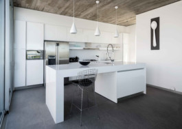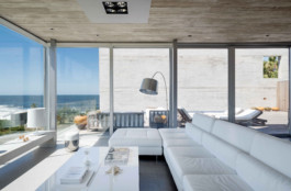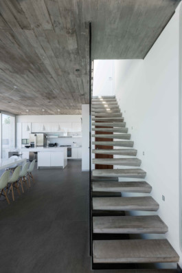 A la casa se accede desde la calle paralela al mar, la más alejada, ingresando por un puente a un gran pórtico de hormigón que contiene la puerta. Este gran prisma gris, muy cerrado a la calle y totalmente abierto al mar, se divide en tres niveles muy claros en sus usos. En la planta del medio se encuentran el living, comedor y cocina, totalmente unidos y conectados con el patio/piscina/parrilla, quizás el corazón de la casa. En la planta alta se disponen los tres dormitorios principales y la suite que comanda el barco en la esquina vidriada y volando hacia el mar. Cada cuarto tiene su baño y sus vistas francas al horizonte marino del Este. En la planta de abajo proyectamos dos dormitorios de huéspedes, un gran playroom con cine, depósitos, lavadero y zona de servicio. Los materiales utilizados le dan color a la casa y al conjunto con sólo hormigón y madera, para prescindir del mantenimiento.