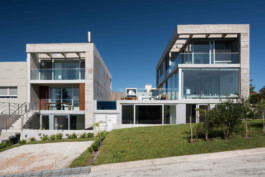 Esta obra consiste en dos casas independientes, una para uso de los dueños, y la otra, netamente de alquiler. Ambas estructuras de hormigón armado visto con encofrados de tablas de pino cepillado, articulan un patio con parrilla y piscina, de uso exclusivo de los dueños de casa. La casa de alquiler tiene una piscina en la azotea con un lugar de estar y una gran vista. La casa principal se ha resuelto en tres plantas con vistas increíbles a la playa y al mar. La situación de apertura de esta casa, a través del patio/piscina, generó una relación impensada con el mar, porque el efecto ocurrido fue de casi penetración en ese ámbito natural tan atractivo que hace que la conexión casa-playa sea total, aun estando separadas por unos 100 metros.