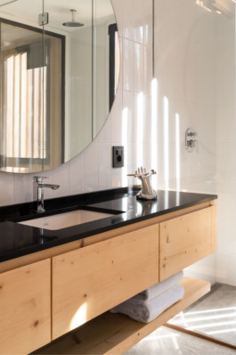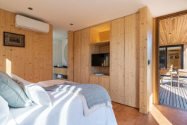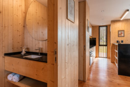 El segundo volumen está conformado por un dormitorio con baño en suite y un espacio destinado al lavadero. Ambos volúmenes están separados por el semicubierto abierto a las vistas francas del campo, un espacio pensado tanto para el ocio como para la contemplación.