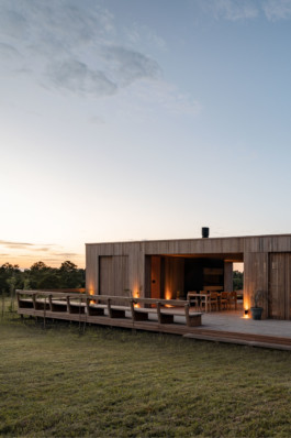 Haciendo referencia al bosque centenario y a la paleta de color del campo, los paramentos exteriores fueron revestidos en tablas de lapacho al natural colocadas de forma vertical y cubriendo de manera íntegra el volumen total.