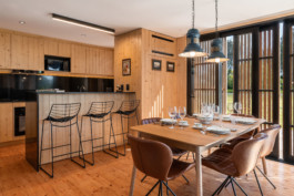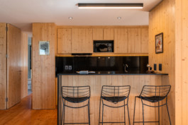El volumen de mayor envergadura consta de un living-comedor con toilette y cocina integrada conformando el área social de la casa. La misma se conecta con un gran deck hacia el norte y hacia el sector de la galería que alberga el parrillero. Un dormitorio principal con su baño en suite se le suman a este volumen principal.