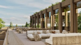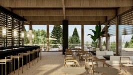 Casi en el centro del conjunto se desarrollan las actividades correspondientes al programa social del edificio conformando un punto de referencia en el recorrido propuesto. En planta baja se encuentra el bar y el espacio de exposición, planteados como un punto de encuentro para los usuarios de las diversas actividades deportivas. Mientras que en planta alta encontramos el restaurante y terraza, espacios que cuentan con visuales hacia todas las orientaciones y a la vez en contacto con las copas de los árboles existentes en el sector.