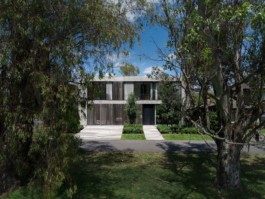 Casa M11 fue pensada como un volumen compacto en un pequeño lote del barrio Miraflores. Implantada frente a un predio despejado con altos eucaliptos, esta casa maciza y pesada se vive desde su interior de un modo permeable con el entorno circundante.