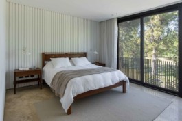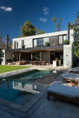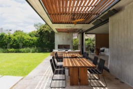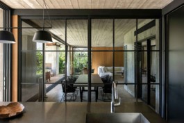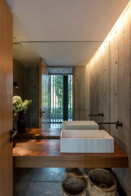 La elección de los materiales permite enfatizar la coexistencia de ambas características: desde el exterior el hormigón visto predominante enfatiza la forma pura y maciza del box, mientras que en el interior los límites se difuminan en todo su perímetro gracias a los grandes ventanales de piso a techo. Esta sensación de continuidad se enfatiza al embutir las carpinterías por completo en los muros, permitiendo la conexión directa con el entorno, viviendo así ambientes interiores amplios y cálidos de abundante madera que se abren hacia el verde exterior.